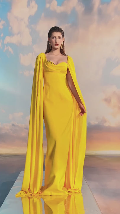 | Special Features | Semi-heart neck with cowl design, Attached rhinestone on the side strap and chest, Symmetric gathered cape sleeves, Asymmetric open back, High slit back, Waist dart |