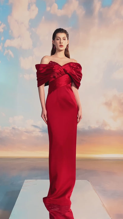 | Special Features | Detachable back cape with knot and button closure, Crossover draped off-shoulder design, Attached crystal on the right chest cup, Waist dart, High slit back, Illusion neck |