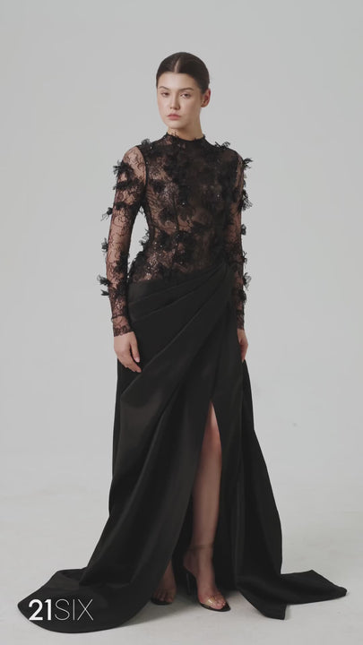 Roxana Slit Flower Applique Taffeta Floor Length Dress