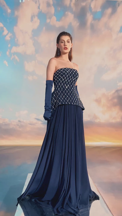 Expertly crafted with a peplum flared design, the dress adds a touch of elegance to any occasion. The crepe fabric drapes beautifully and its floor length creates a flattering silhouette. Perfect for formal events or special occasions.