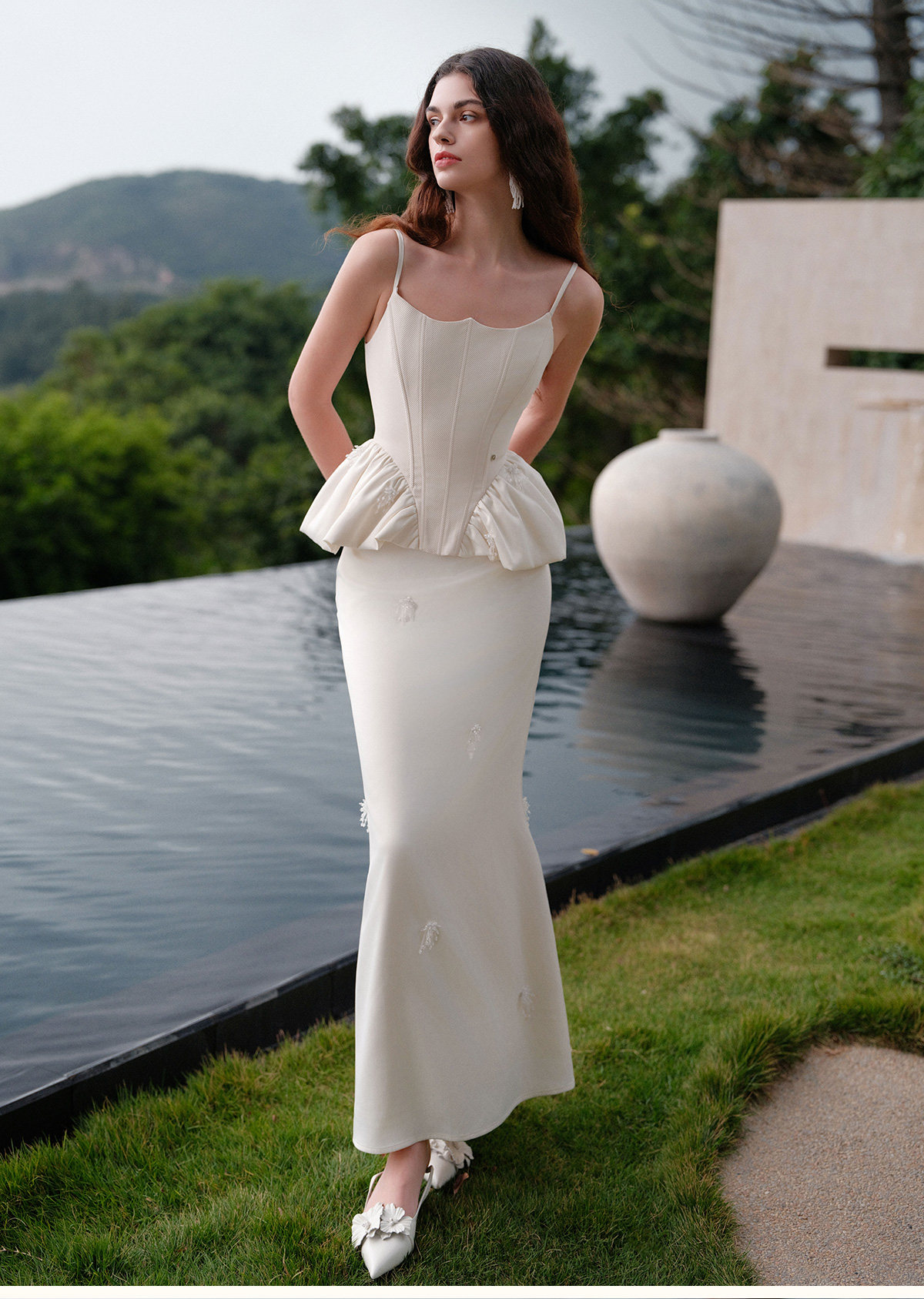 Zali Light Luxury Handmade Pearl Flower Slimming Wrapped Satin Strap Skirt Long Skirt Set