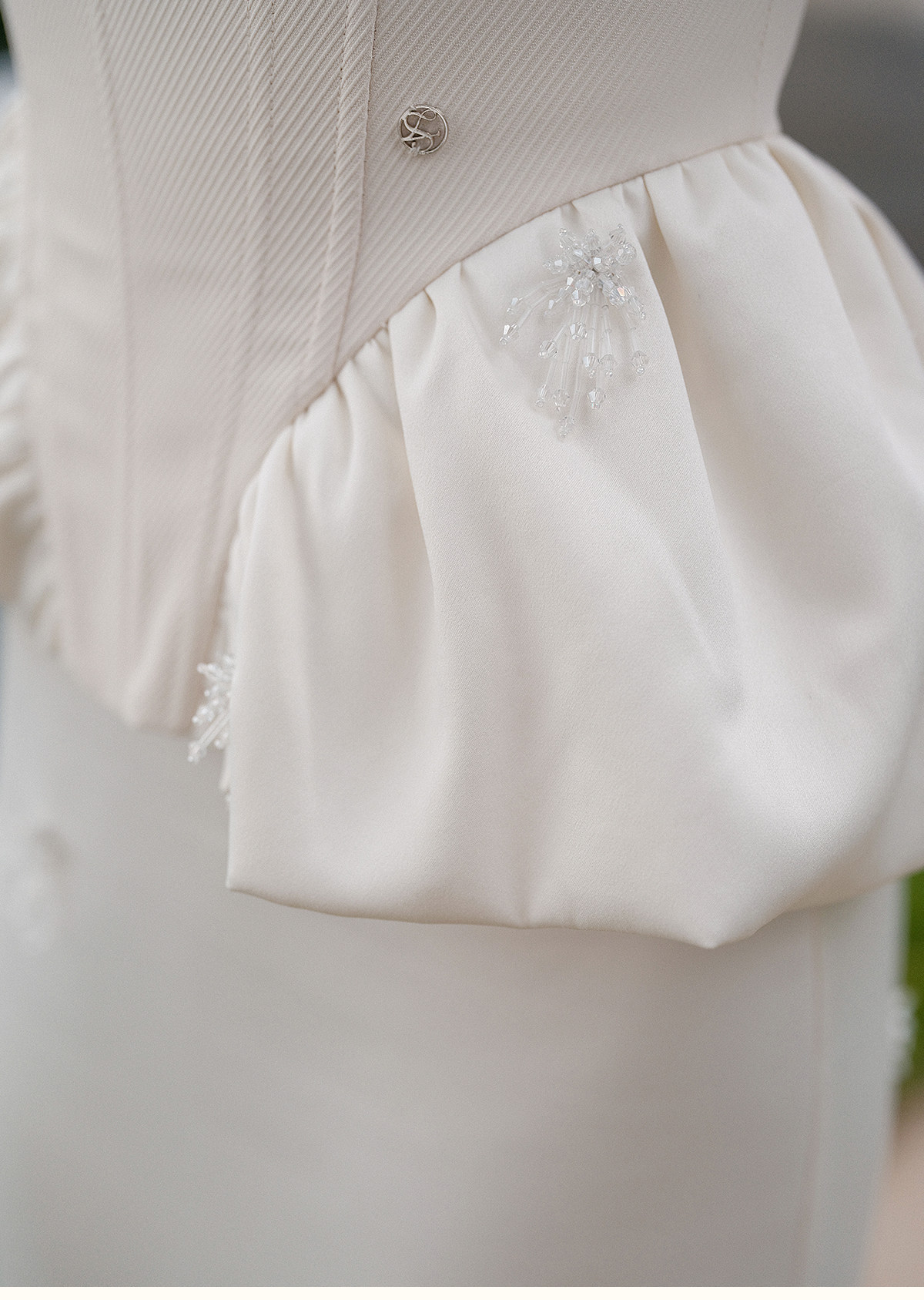 ensures a perfect fit by tailoring the dress to your unique measurements, eliminating the need for major alterations. This aligns with our values of intentionality, sustainability, and unparalleled craftsmanship. By focusing on made-to-order designs, we reduce waste and create a truly personalized experience for each bride.