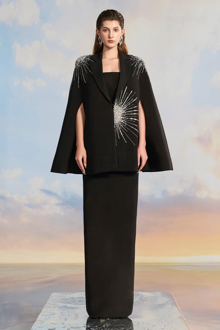 This cape features a unique trapezoid notch lapel design, adding a touch of sophistication to any outfit. Made from high-quality crepe fabric, this cape drapes elegantly and offers a structured silhouette. Perfect for adding a modern twist to any ensemble.