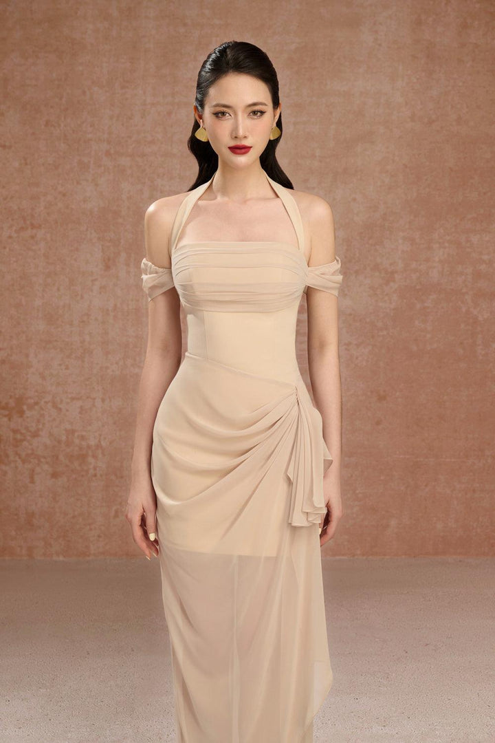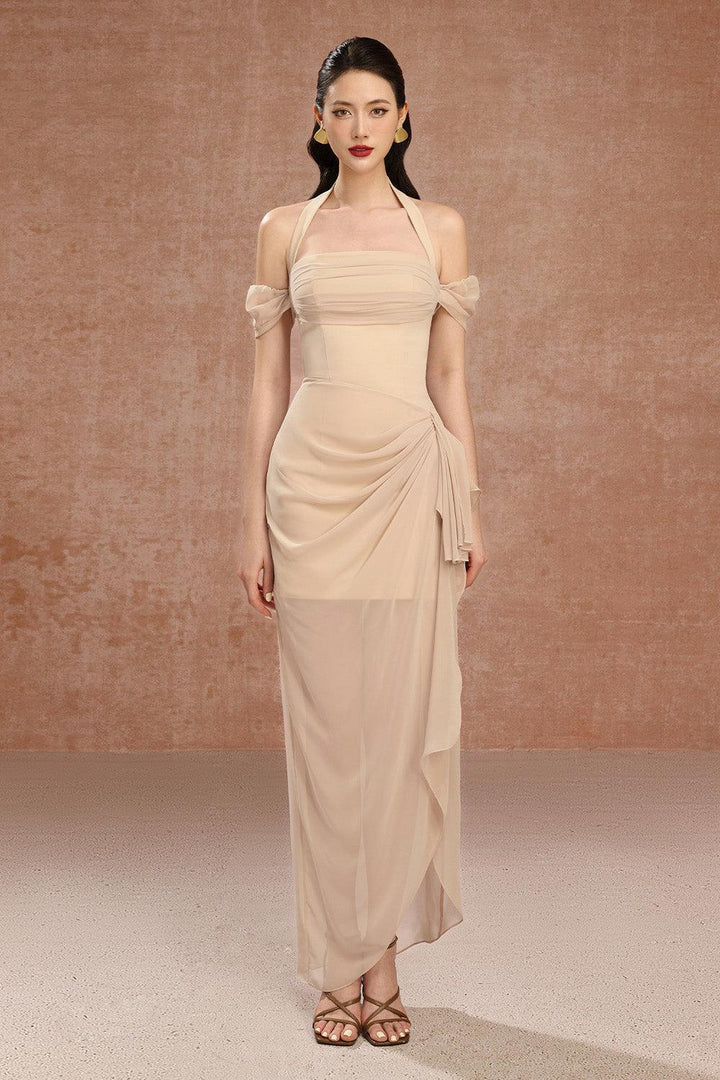 June Halter Cold Shoulder Sleeved Twill Ankle Length Dress Beige Maxi Dress DeNio