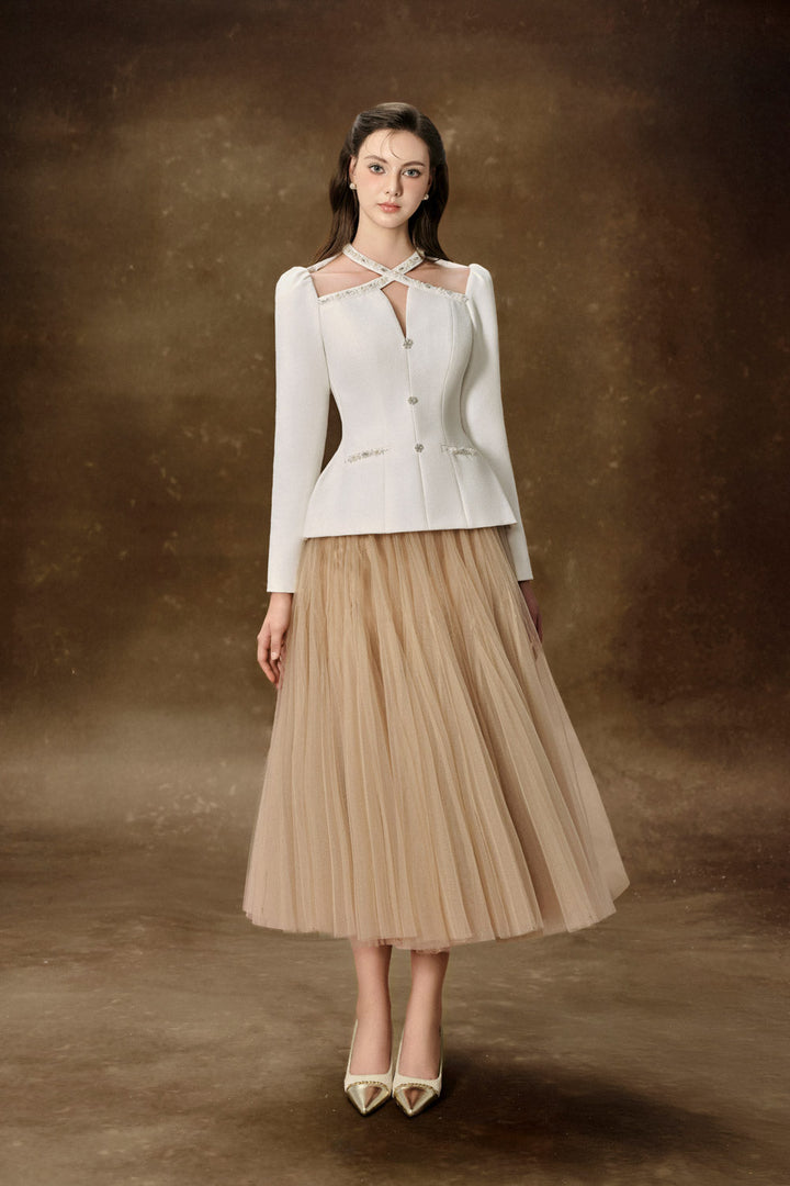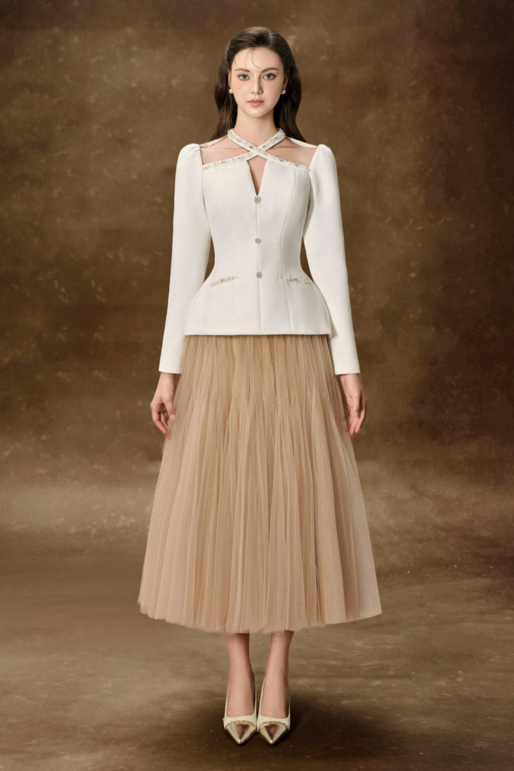 Made with high-quality tulle fabric. this skirt has a stunning gathered design that adds dimension to any outfit. The elegant flared cut is perfect for special occasions or adding a touch of glamour to your everyday style.
