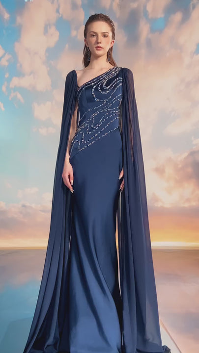| Special Features | Symmetric gathered sheer cape sleeves, Attached rhinestone created wavy shape, Draped at the back, Diagonal neck |