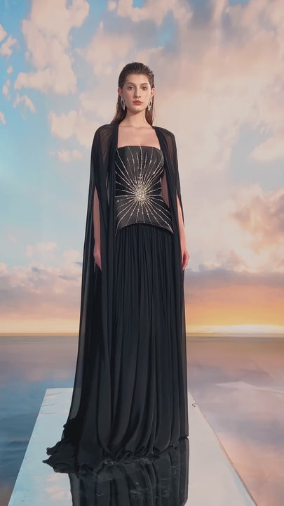 | Special Features | Sunburst with rhinestone attached at the top, Gathered flare bottom, Backless gathered cape, Corset waist, Sheer effect |
