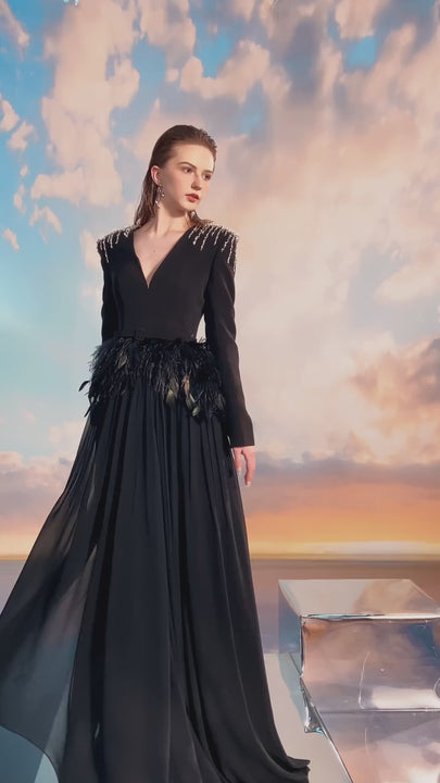 Victoria Gathered Plunge Neck Chiffon Floor Length Dress