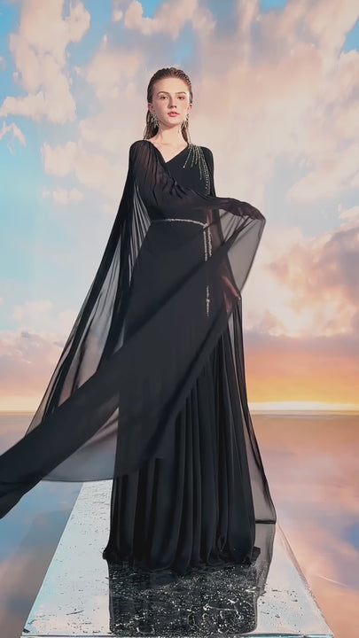 Xavia Gathered Cape Sleeved Chiffon Floor Length Dress