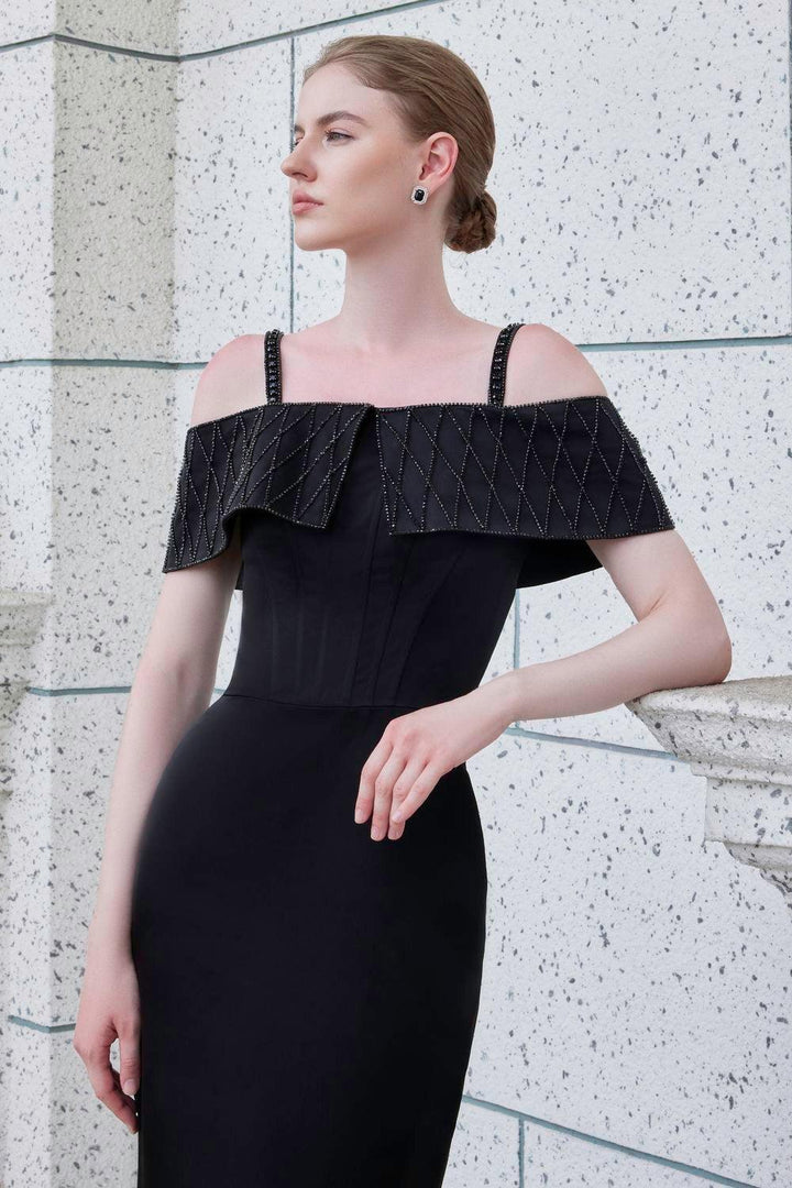 Indulge in the luxury of the dress. With a sleek sheath silhouette and elegant cold shoulder sleeves. this dress exudes sophistication and exclusivity. Made from high-quality taffeta silk. it offers both style and comfort. making you stand out at any event.