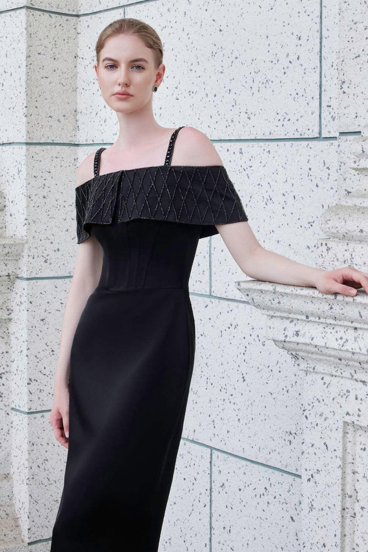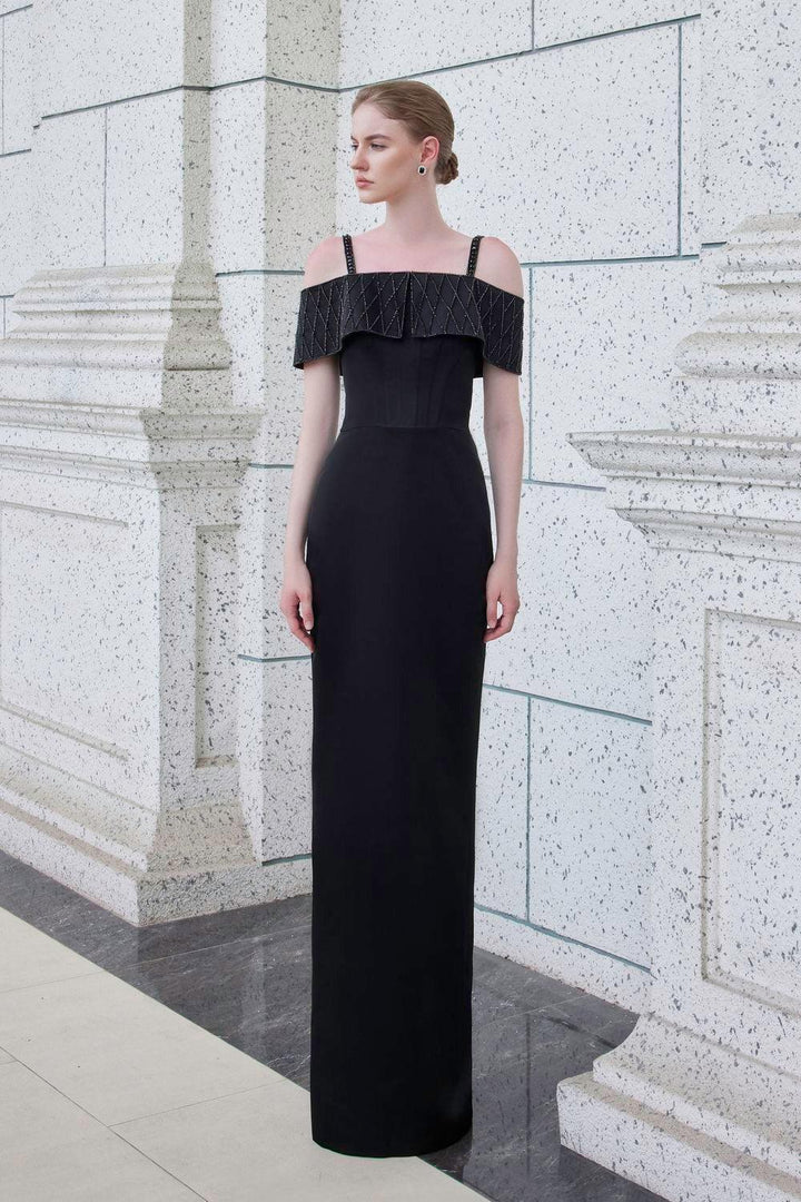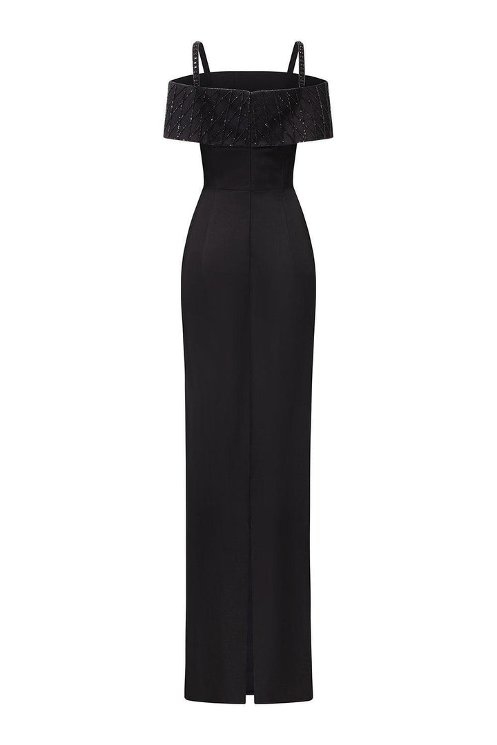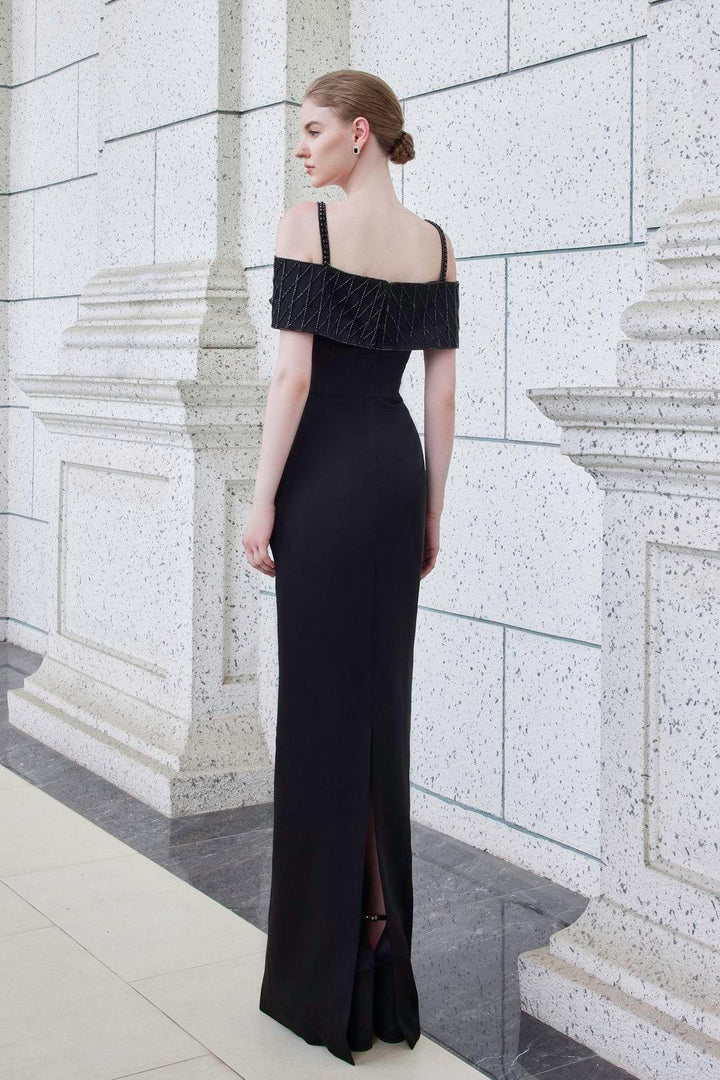Immerse Sheath Cold Shoulder Sleeved Taffeta Silk Floor Length Dress Black Gown Dress I.H.F Atelier
