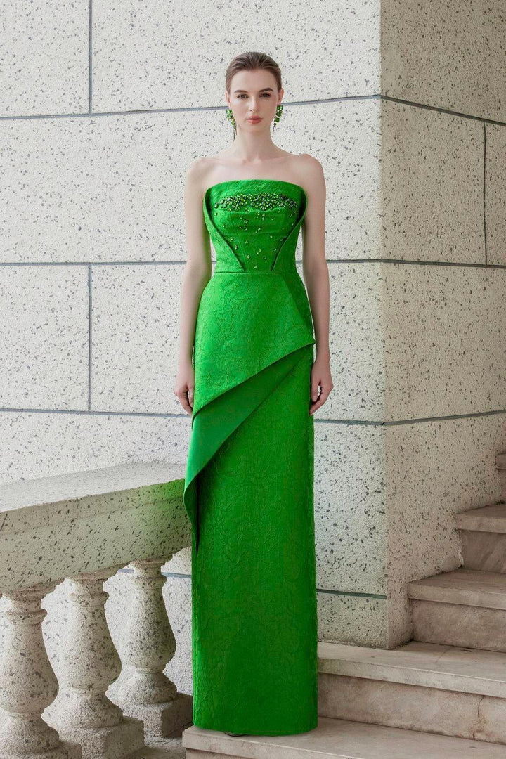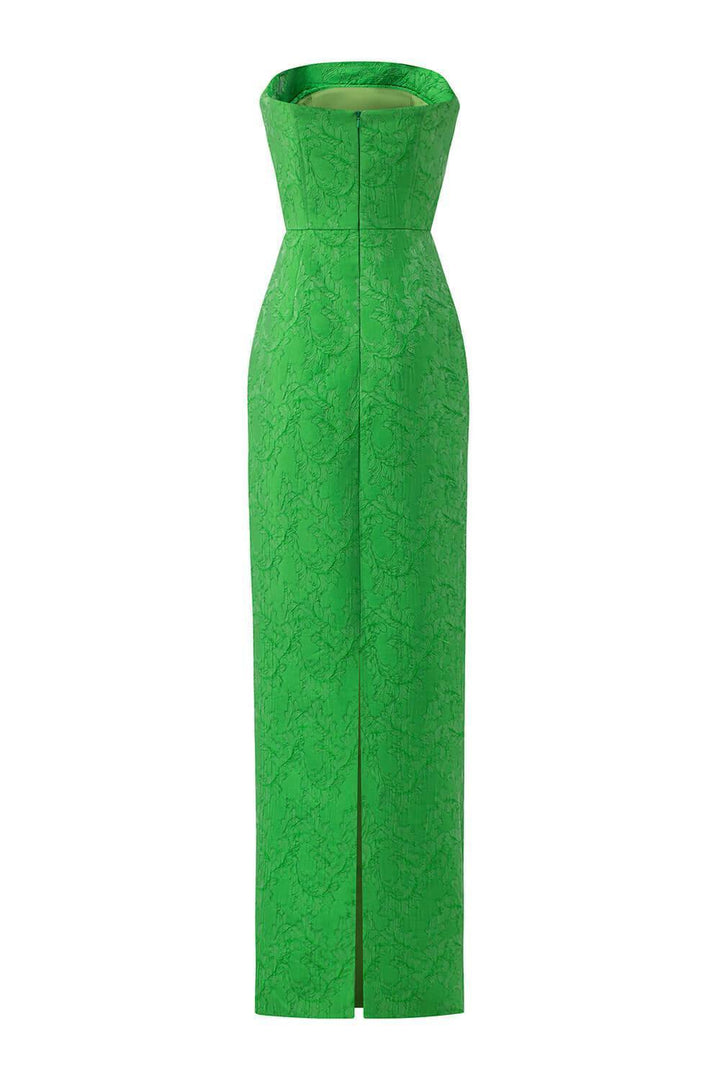 Indulge in luxury and sophistication with our dress. The straight across-neck and floor length silhouette exudes elegance. while the jacquard fabric adds a touch of texture and style. Perfect for any formal occasion. you'll feel like royalty in this exclusive and tasteful piece.