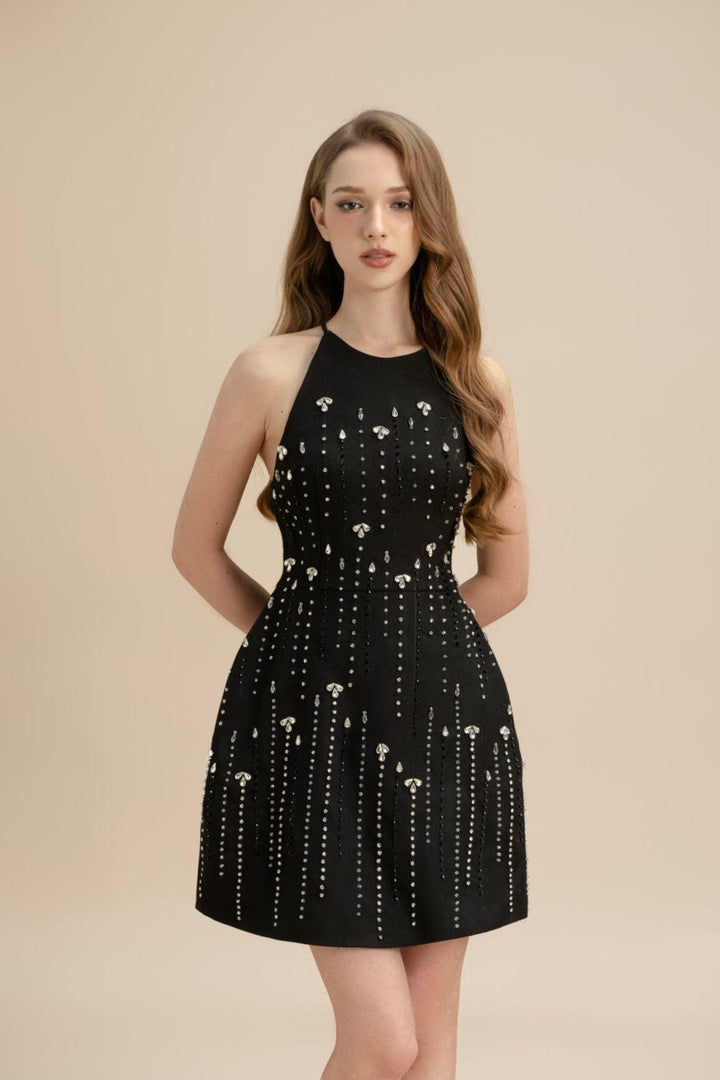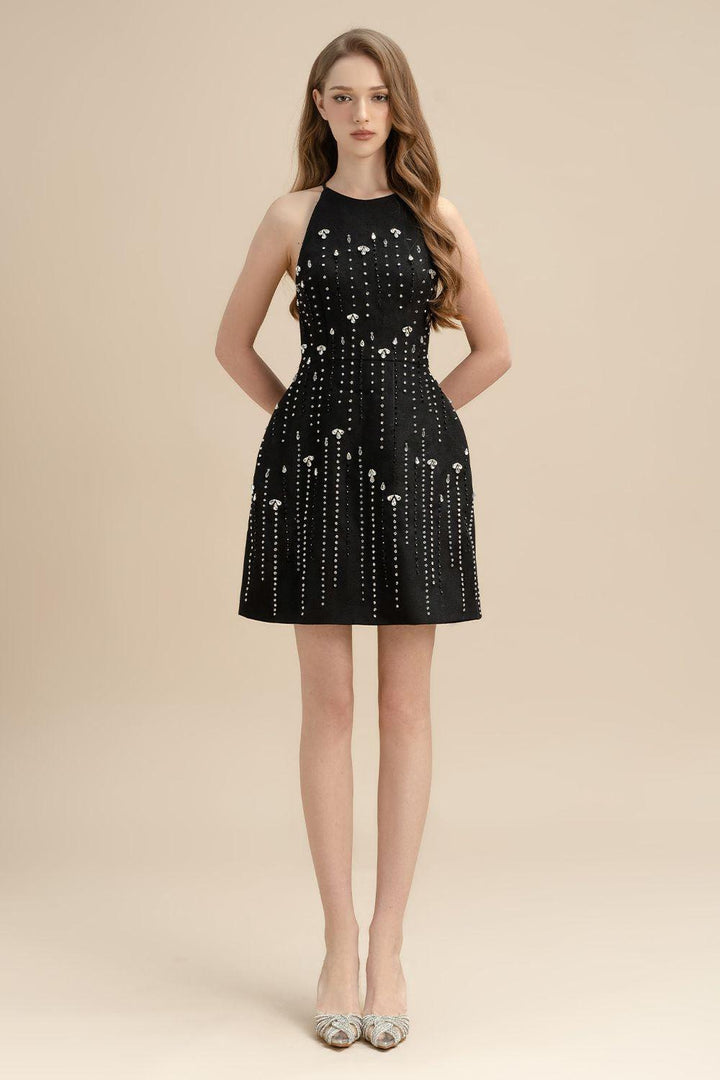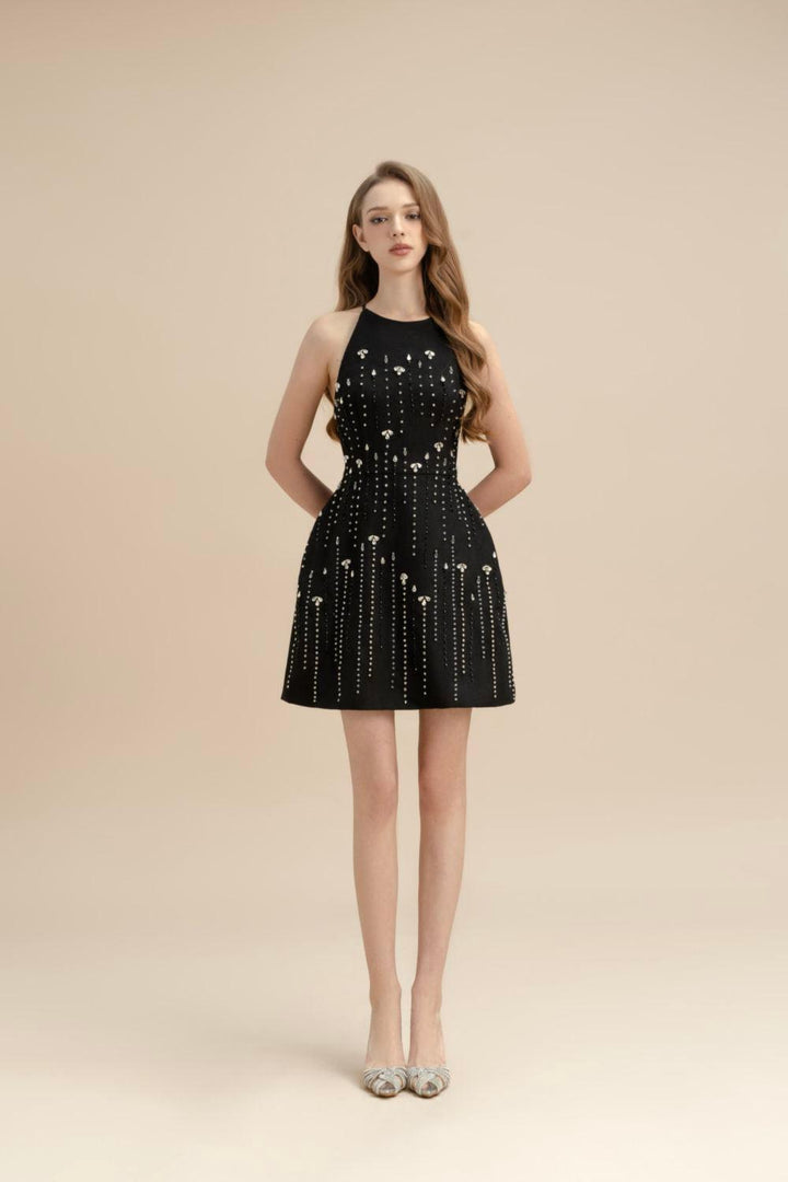 Crafted with luxurious scuba crepe fabric. this mini dress exudes sophistication and grace. The sheath silhouette and stone detailing add a touch of exclusivity. making it the perfect option for your next special occasion.