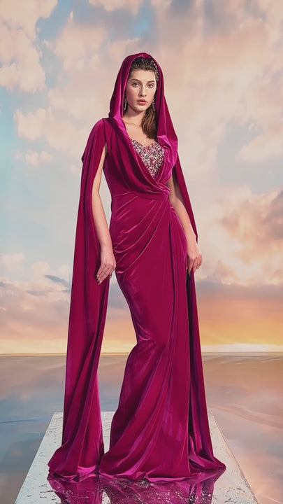 Expertly crafted with a stylish crossover hooded neck design, the dress brings elegance to your wardrobe. Made from luxurious velvet, this floor-length dress is perfect for any formal occasion. Elevate your style with this sophisticated and unique piece.