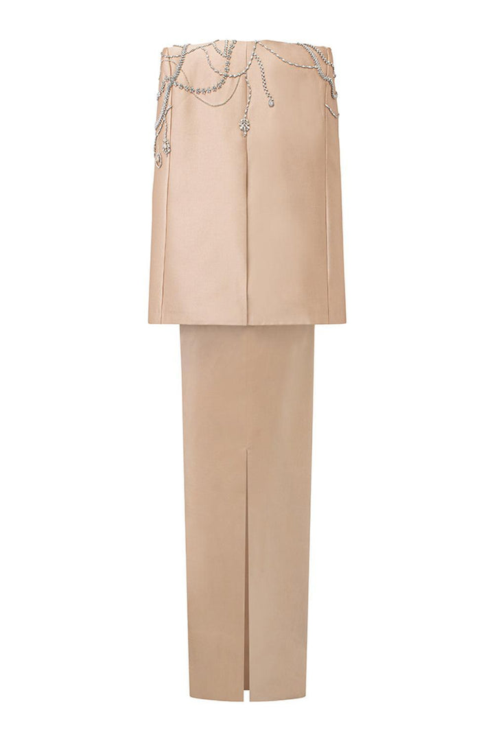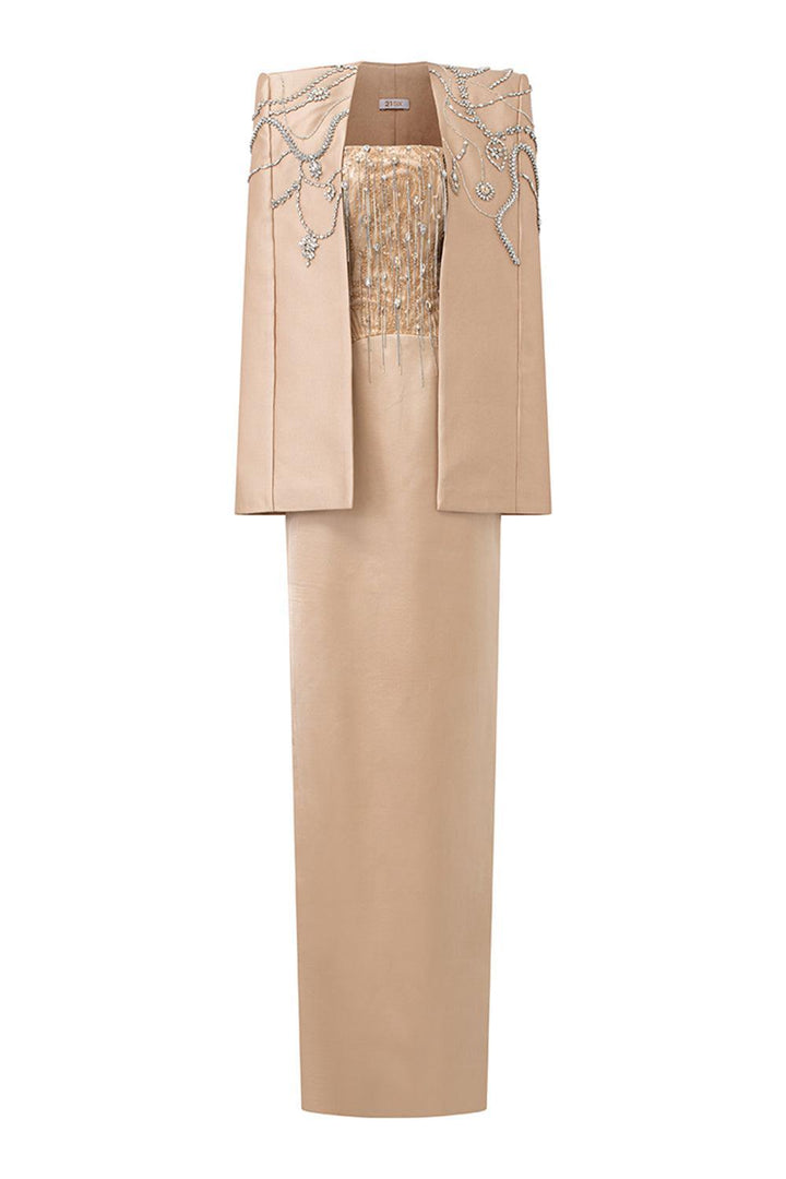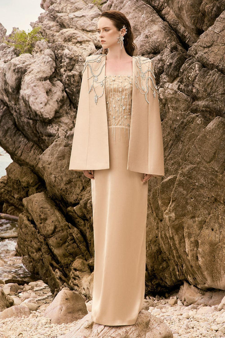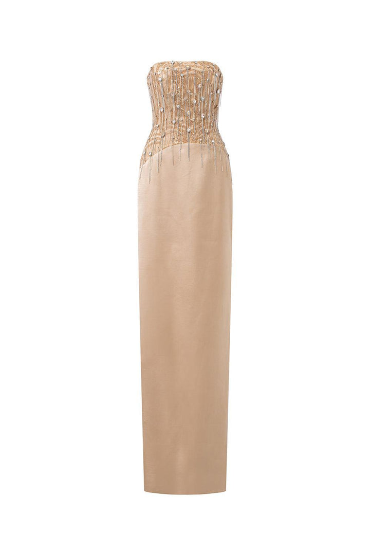 Made from premium silk satin. this dress exudes elegance and sophistication. With a straight back design and a slit for added flair. this dress is perfect for any special occasion. Enhance your wardrobe with this tasteful and exclusive piece.