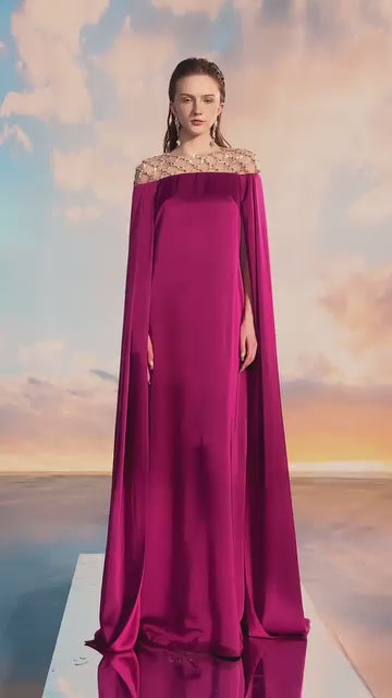 Exude elegance and grace in our dress. Featuring a flattering straight illusion neck, this luxurious silk satin dress will add a touch of sophistication to any special occasion. With its floor length silhouette, make a lasting impression with our impeccable design.