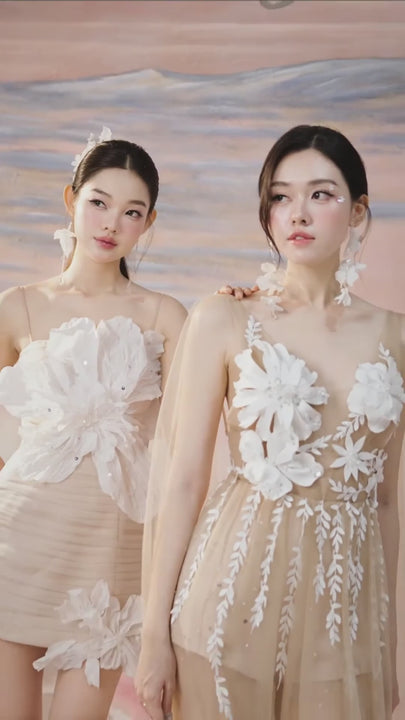 | Special Features | Embellished 3D floral and leaves on the bodice, Deep plunging neck with mesh connected, Attached symmetric cape on the shoulder, Gathered see-through skirt, Sheer effect, Taffeta shorts lining |