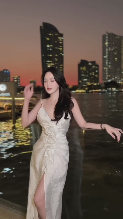 Special Features Spaghetti strap with cord design, Crinkle detail in the surface fabric, Attached 3D floral along the bodice, High front slit, Two-layer skirt, Deep plunge neck