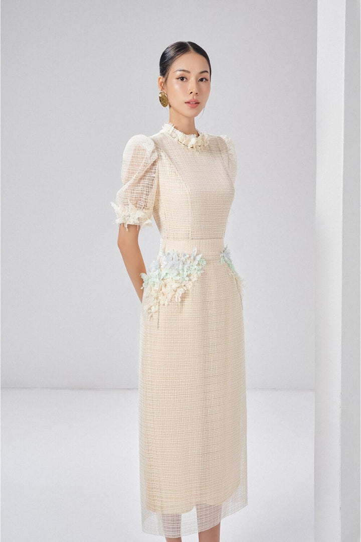 Alaina Straight Short Sleeved Mesh Lace Midi Dress Beige Checked Midi Dress Maison des Copains