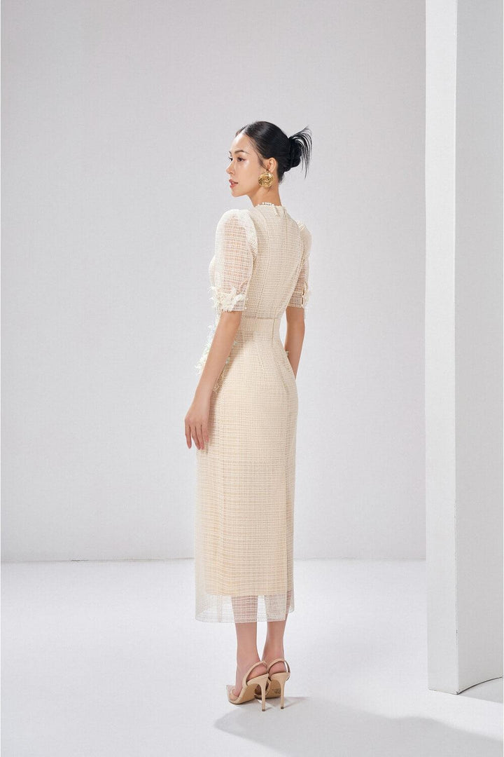 Adorn yourself with this elegant dress. perfect for any formal occasion. Crafted from beige mesh lace and featuring luxurious short sleeves. this midi dress is sure to make a timeless fashion statement. Showcase the attached. delicate floral details for a touch of sophistication and style.