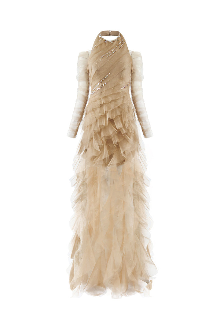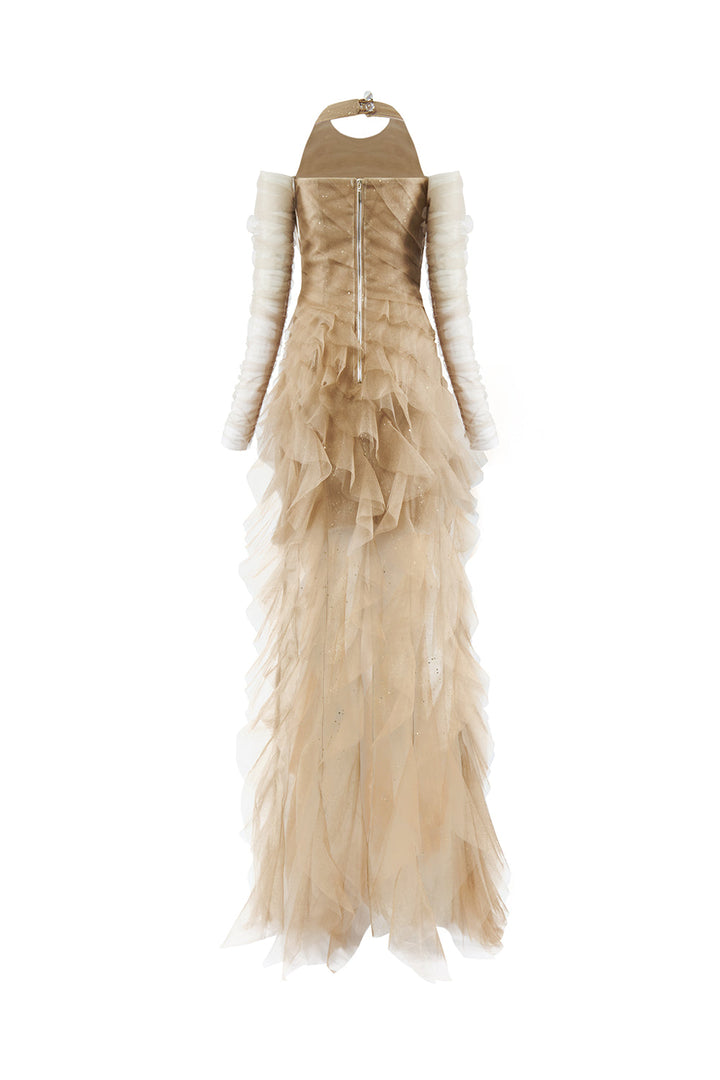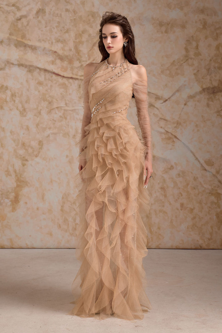 Aurielle Sheath Ruffle Trim Mesh Floor Length Dress