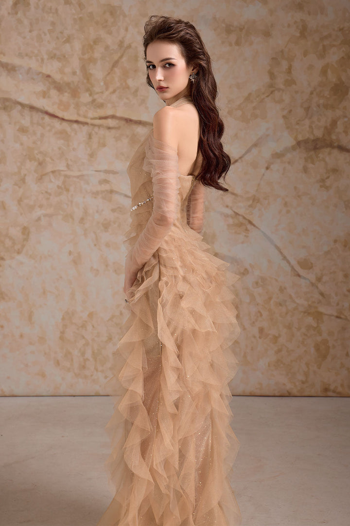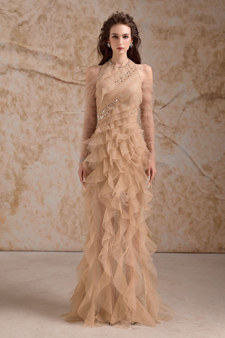 Its floor length design and delicate ruffle trim details create a sophisticated and feminine silhouette. Perfect for any formal event. this dress is a must-have for those looking to make a statement.