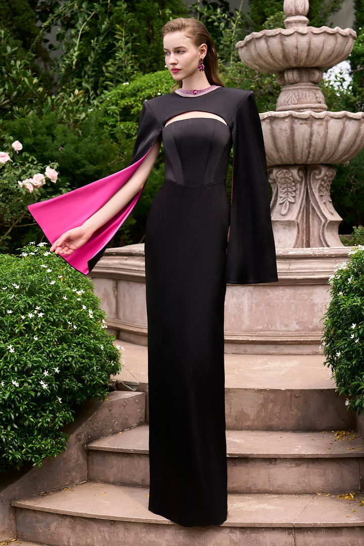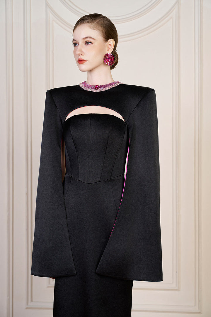 Effortlessly chic with a strapless design and elegant cape shoulder. this dress is the perfect choice for any special occasion. Crafted with luxurious silk fabric. it exudes sophistication and refinement. Elevate your style with this stunning dress.