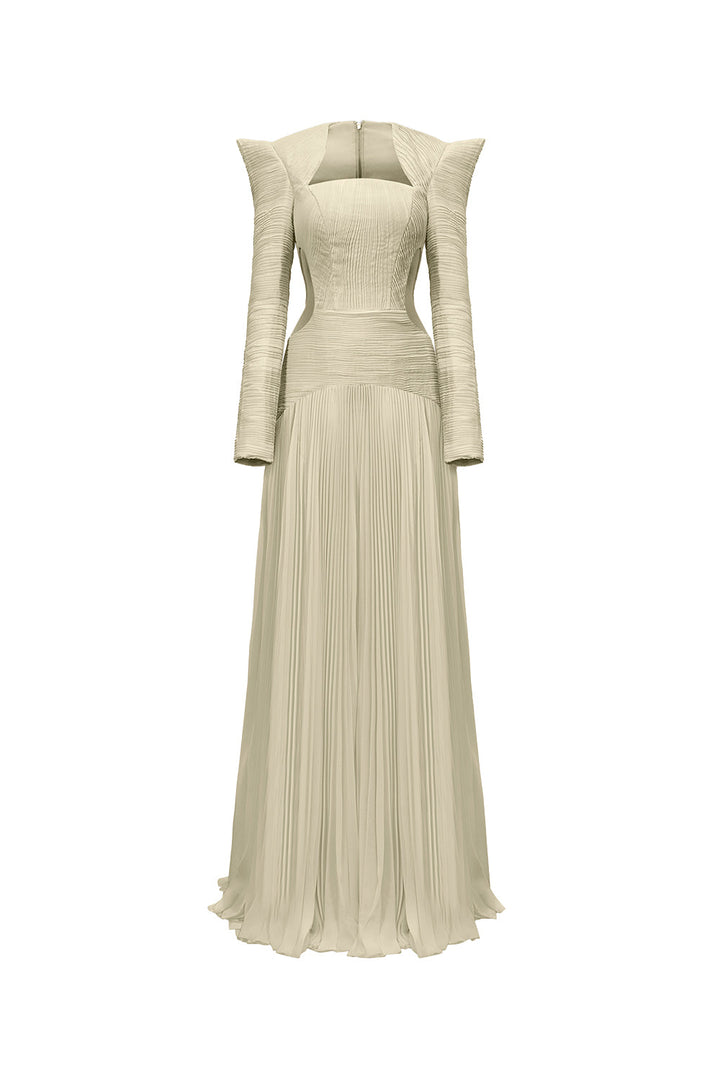This versatile and elegant dress is a must-have addition to any wardrobe. Its square shoulder design adds a touch of modernity while the chiffon fabric flows beautifully to floor length. Perfect for any special occasion. this dress is sure to make you look and feel your best.