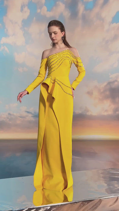 The unique asymmetric off-shoulder neckline adds a modern twist to this elegant piece, perfect for any formal occasion. Made with high-quality crepe fabric, this dress exudes sophistication and comfort.