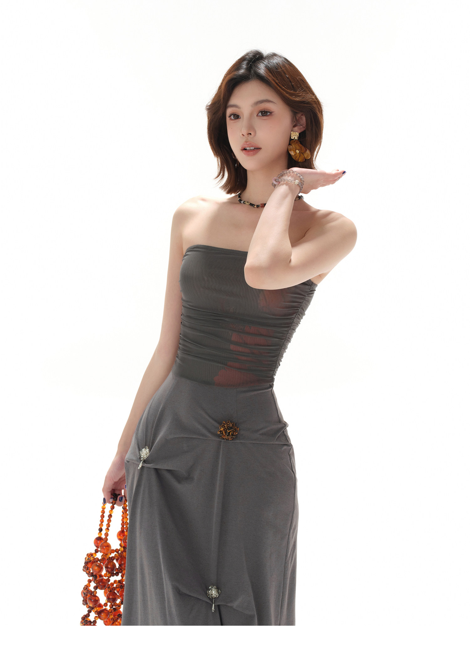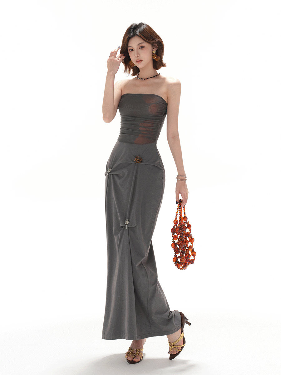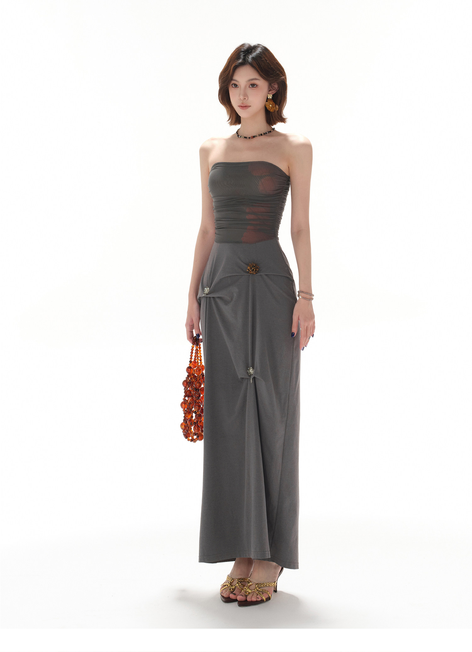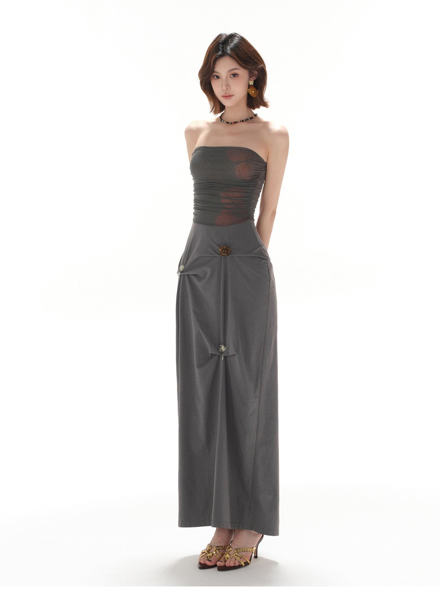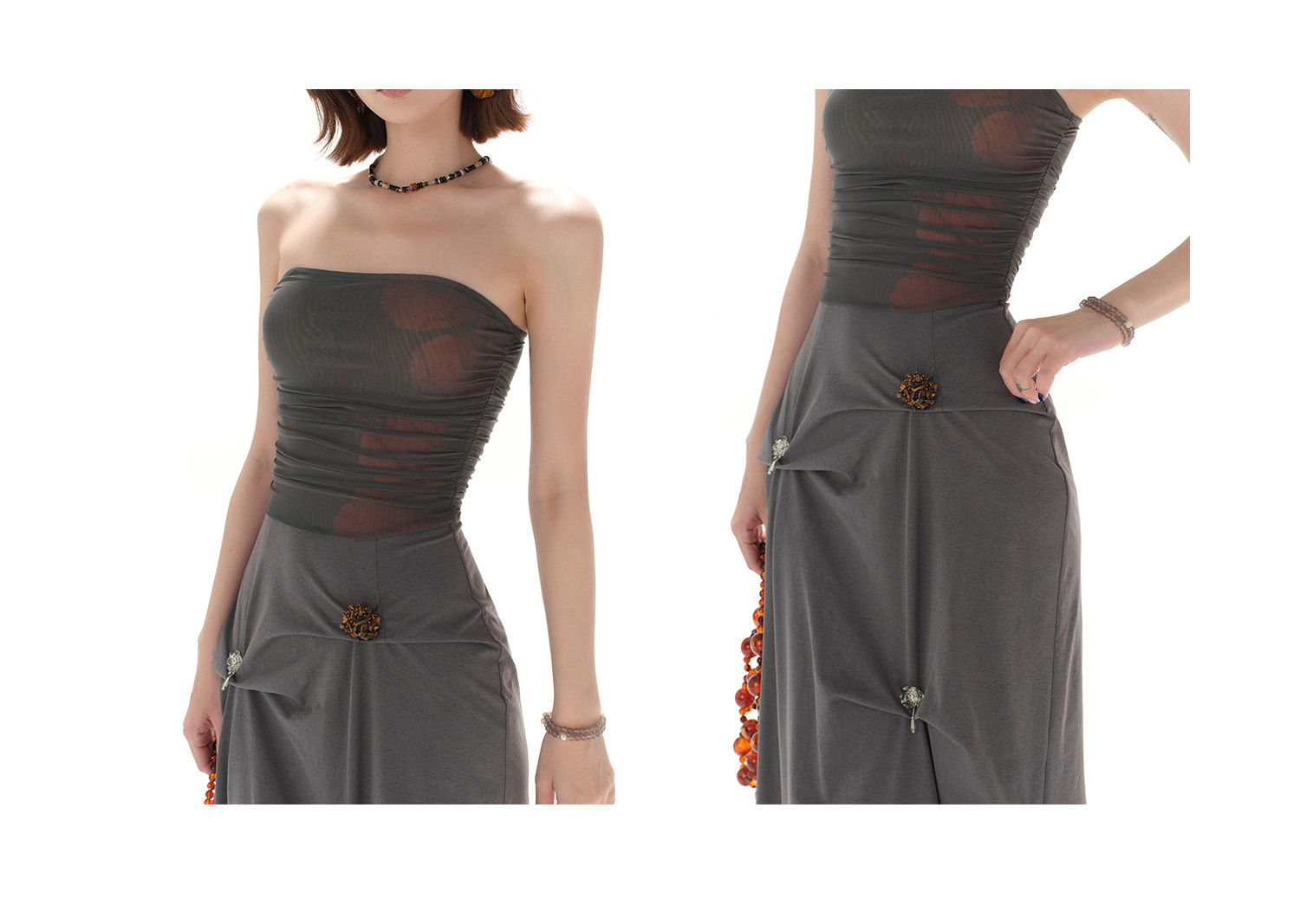 RessaLina French Elegance Embroidered U-Neck Bodycon Dress - Floral Print, High Slit, Sky Blue grey Dress RESSALINA