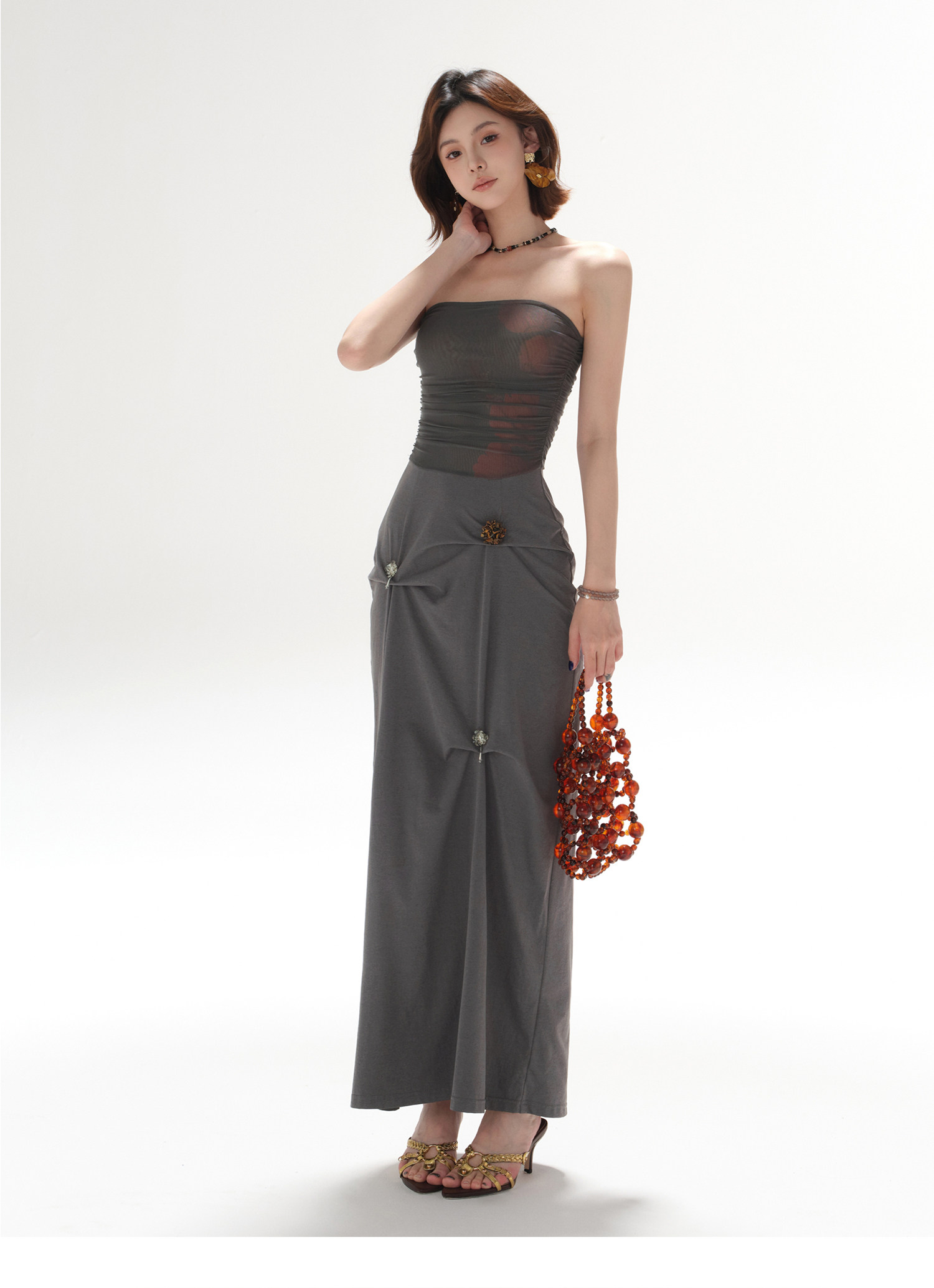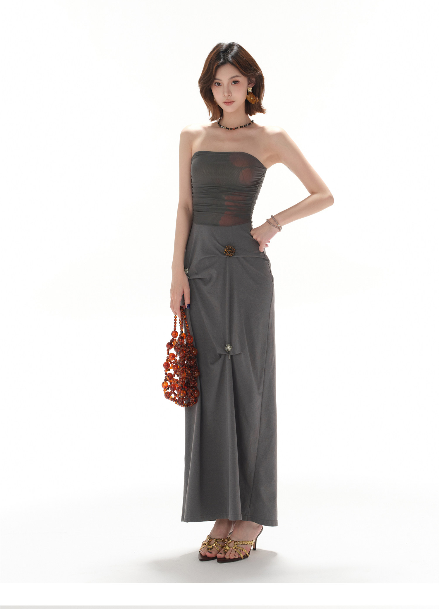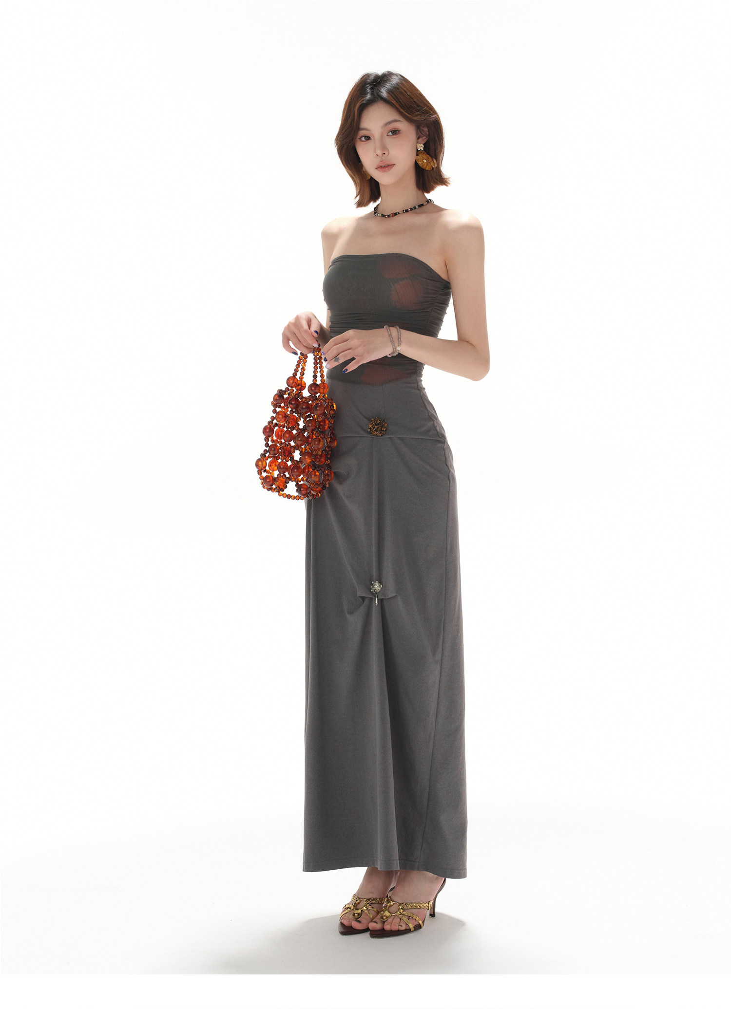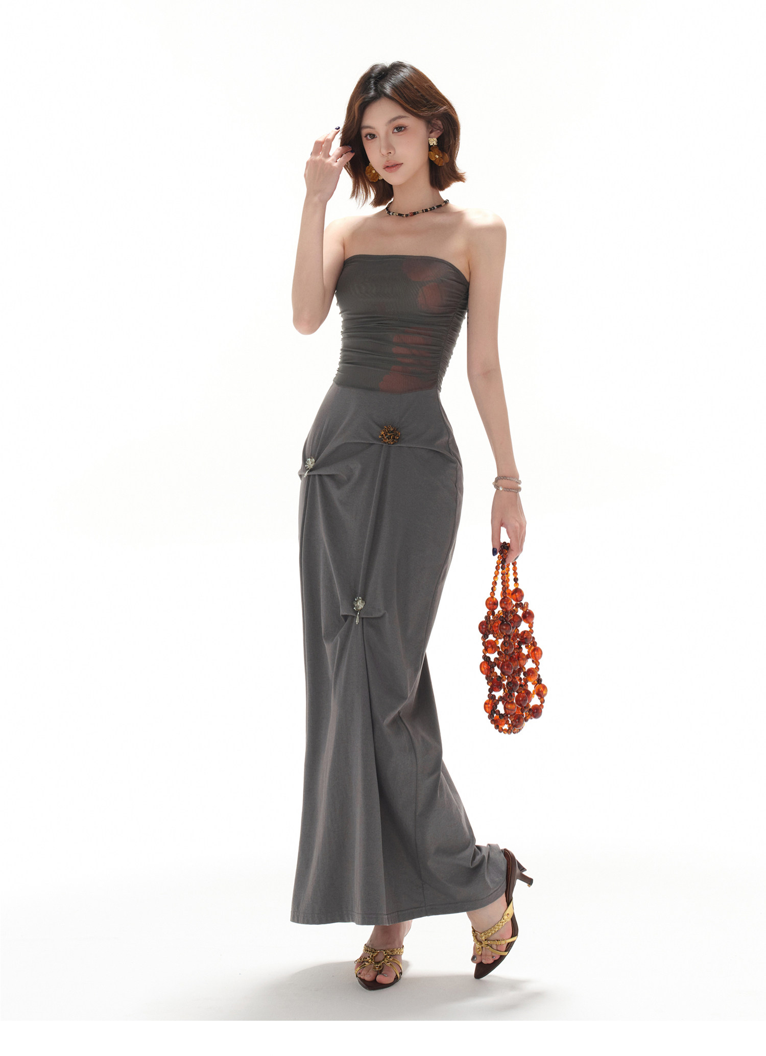 RessaLina French Elegance Embroidered U-Neck Bodycon Dress - Floral Print, High Slit, Sky Blue grey Dress RESSALINA