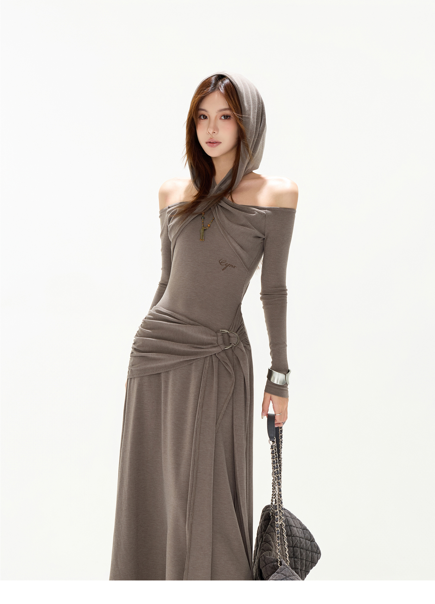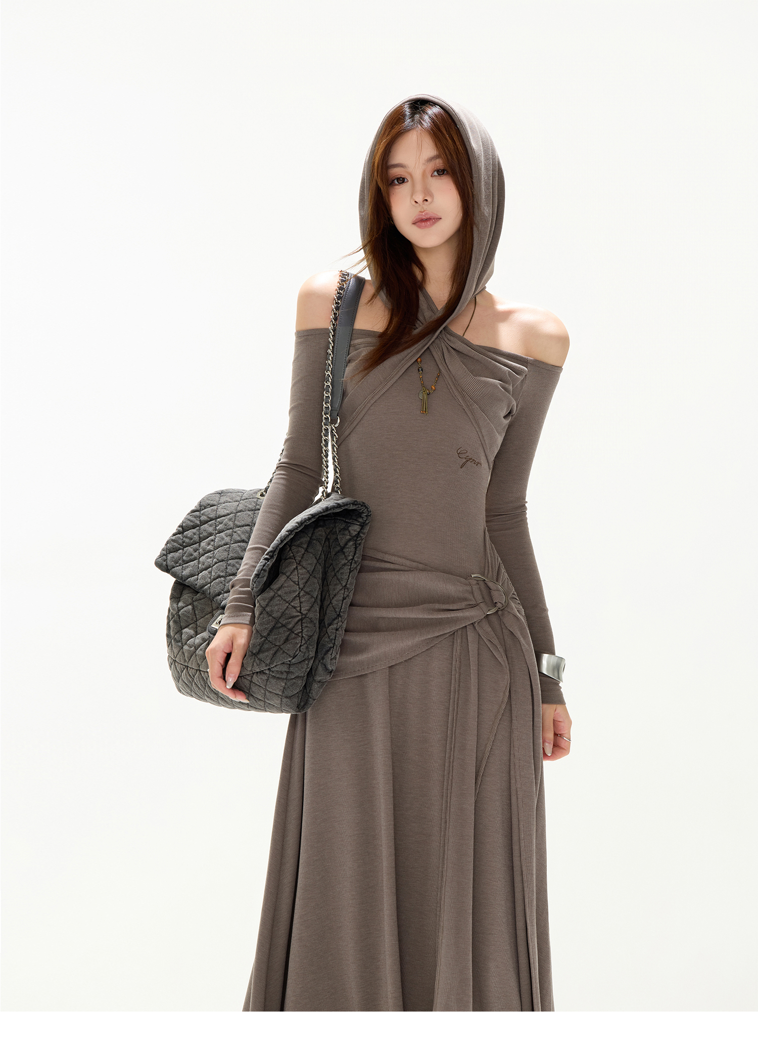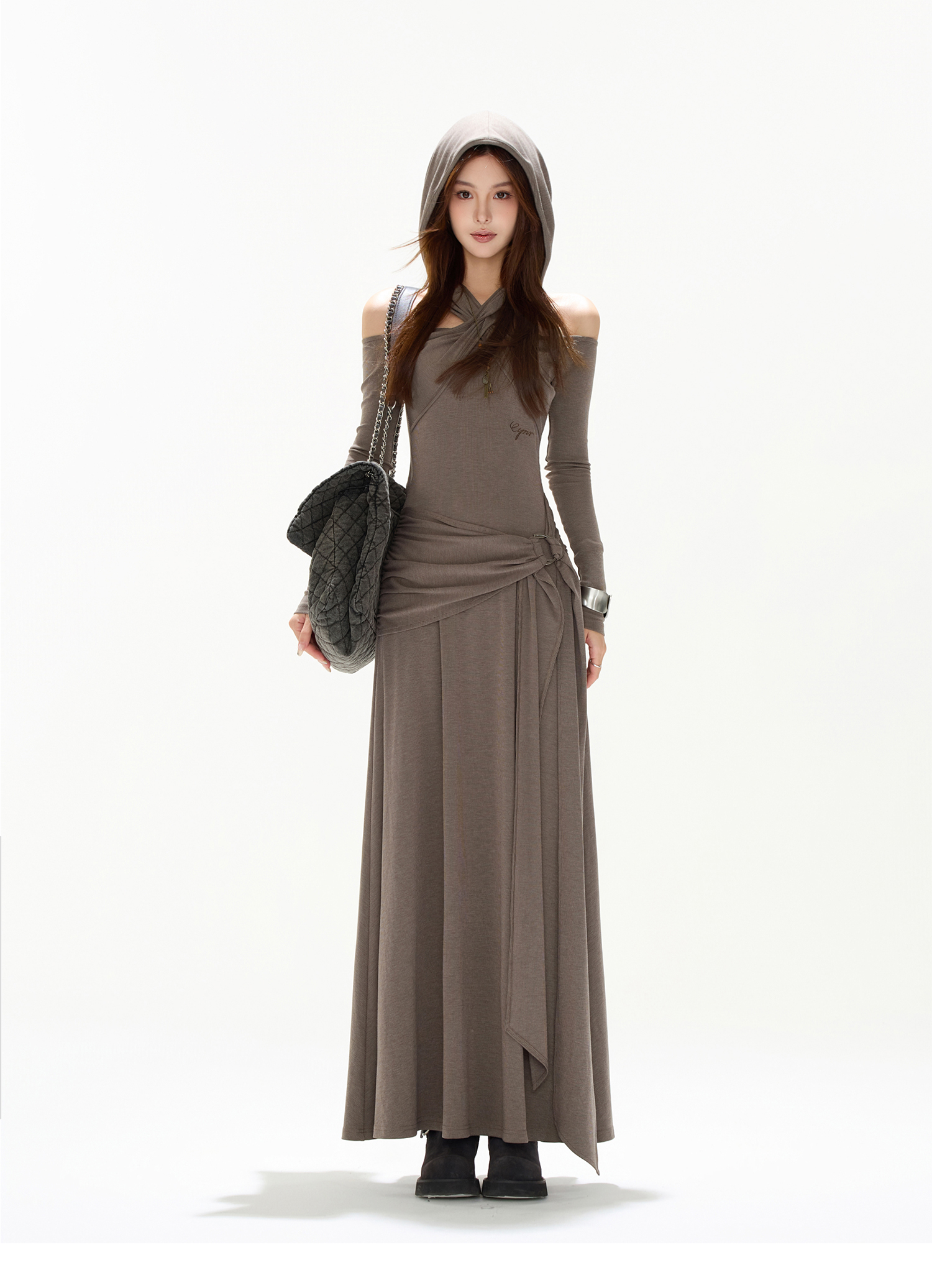 RessaLina Old Money Sexy Knit Dress - Cross-Neck Hoodie One-Shoulder, Cropped Waist Tie, Desert Camel