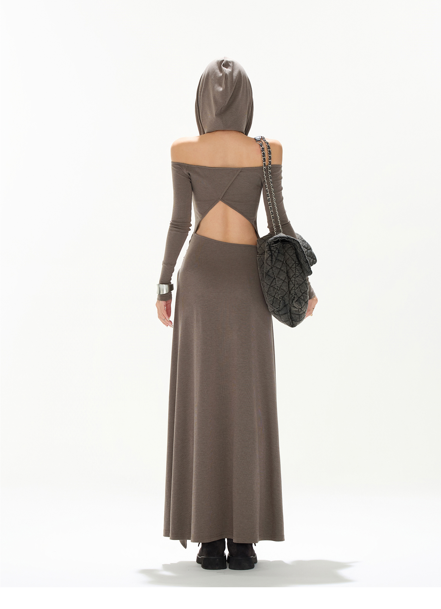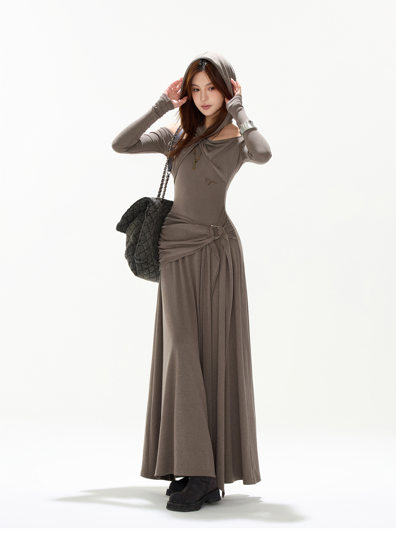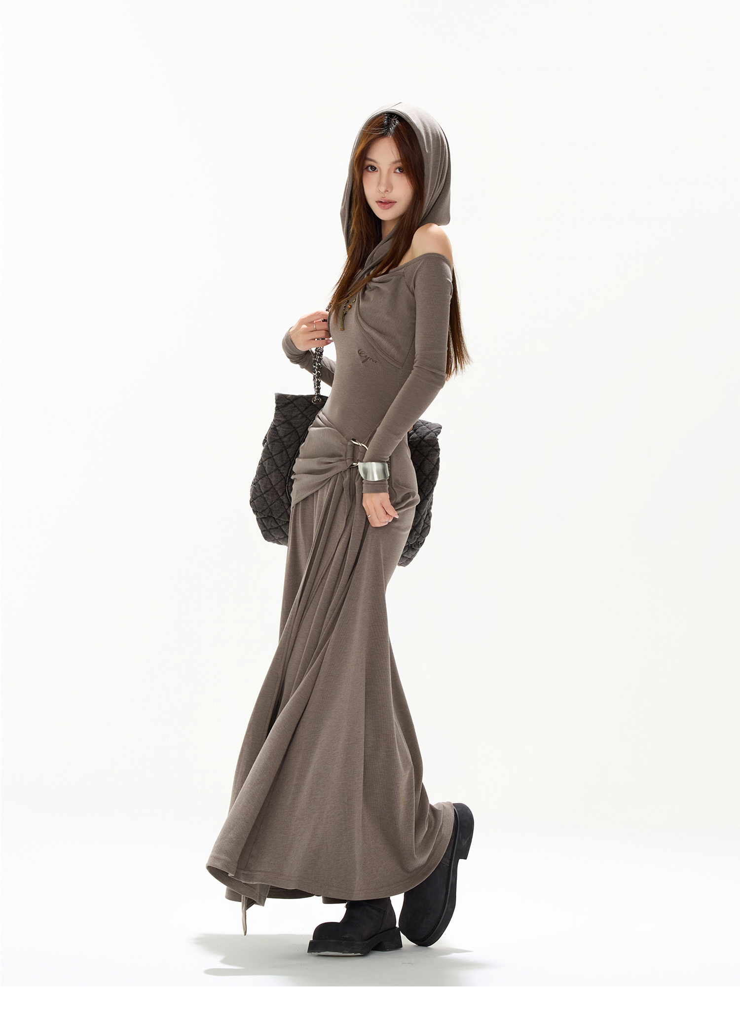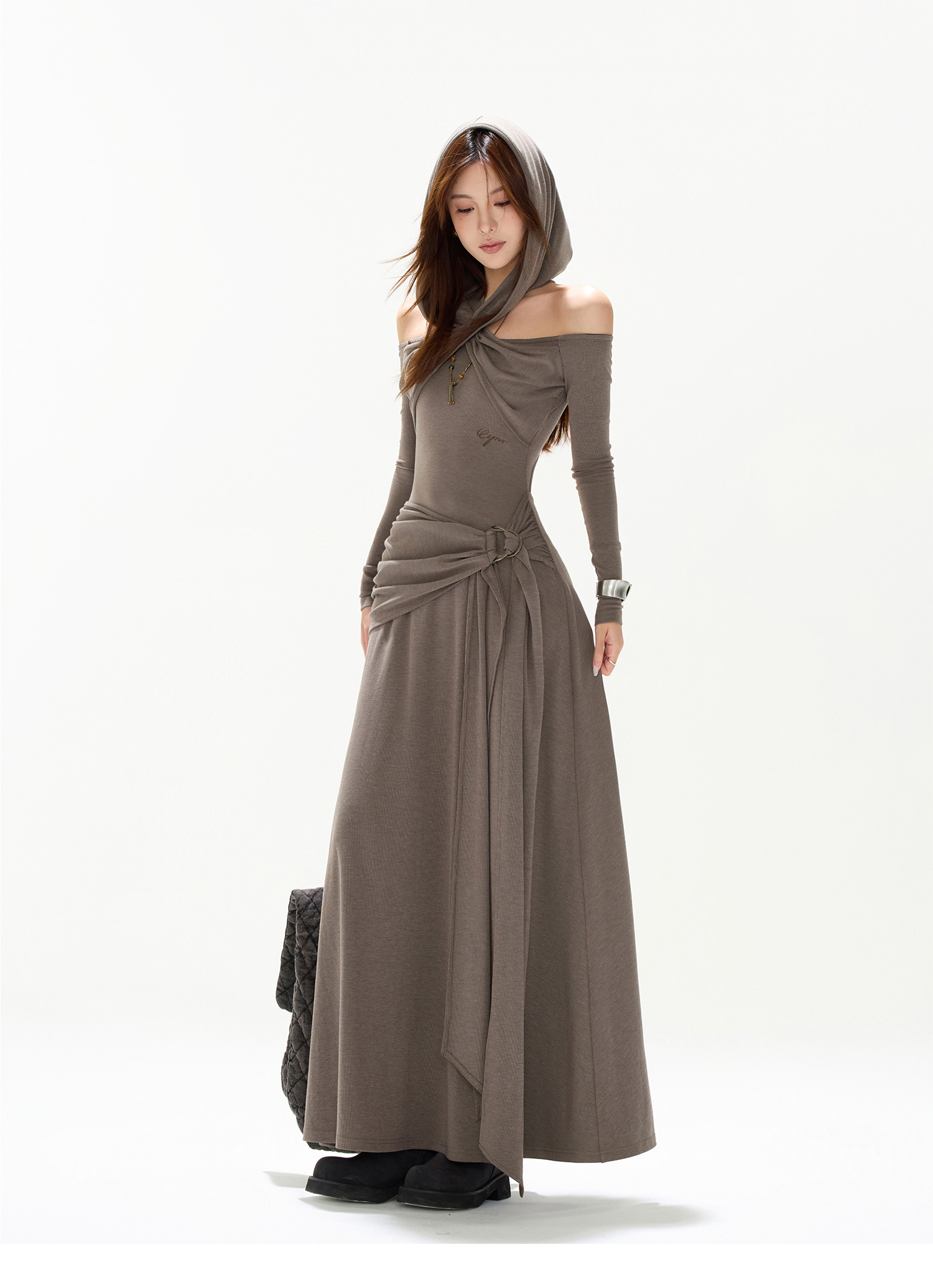 RessaLina Old Money Sexy Knit Dress - Cross-Neck Hoodie One-Shoulder, Cropped Waist Tie, Desert Camel