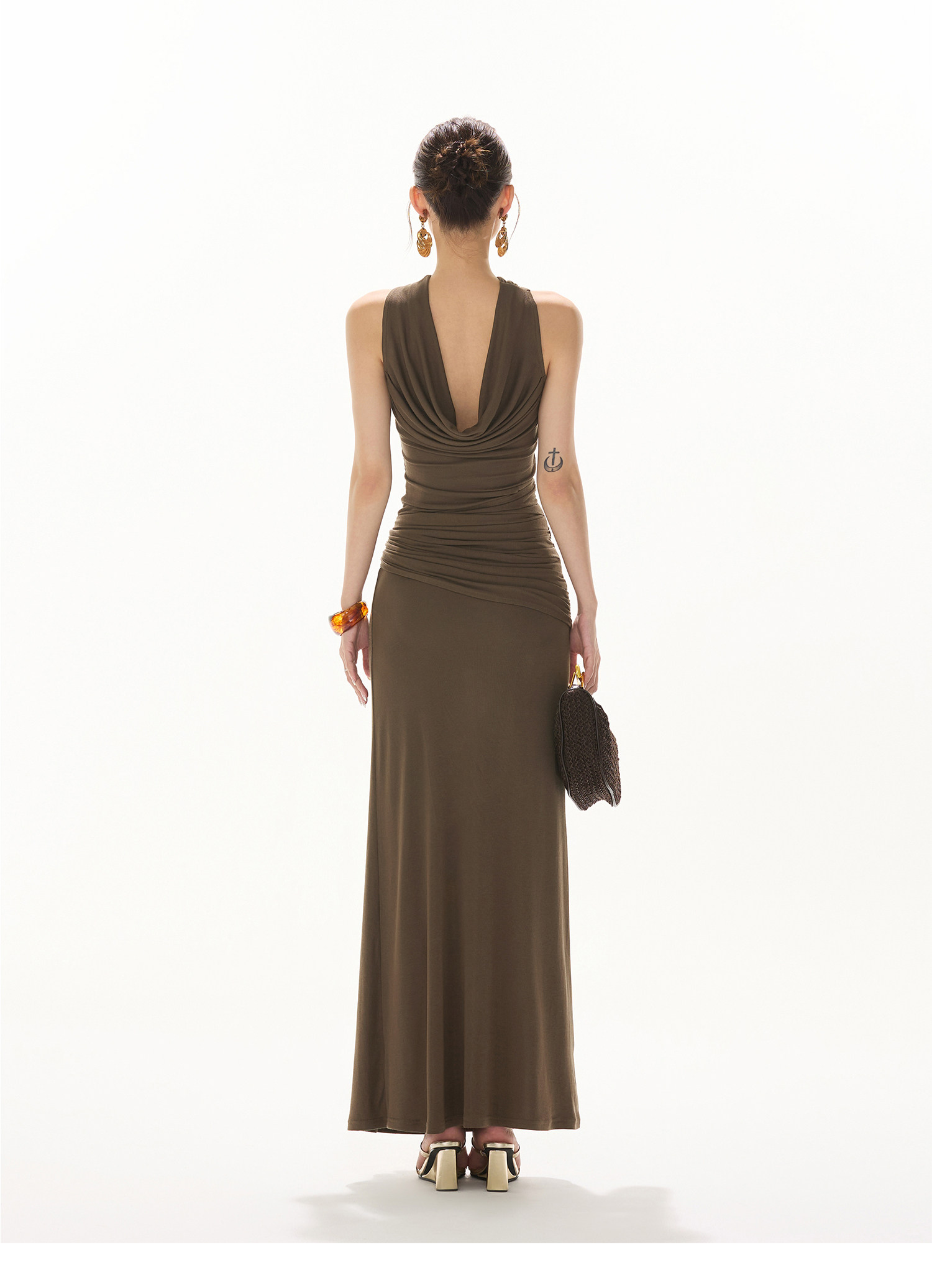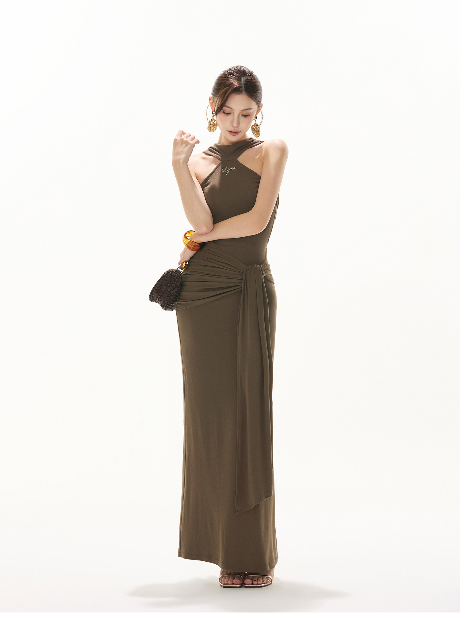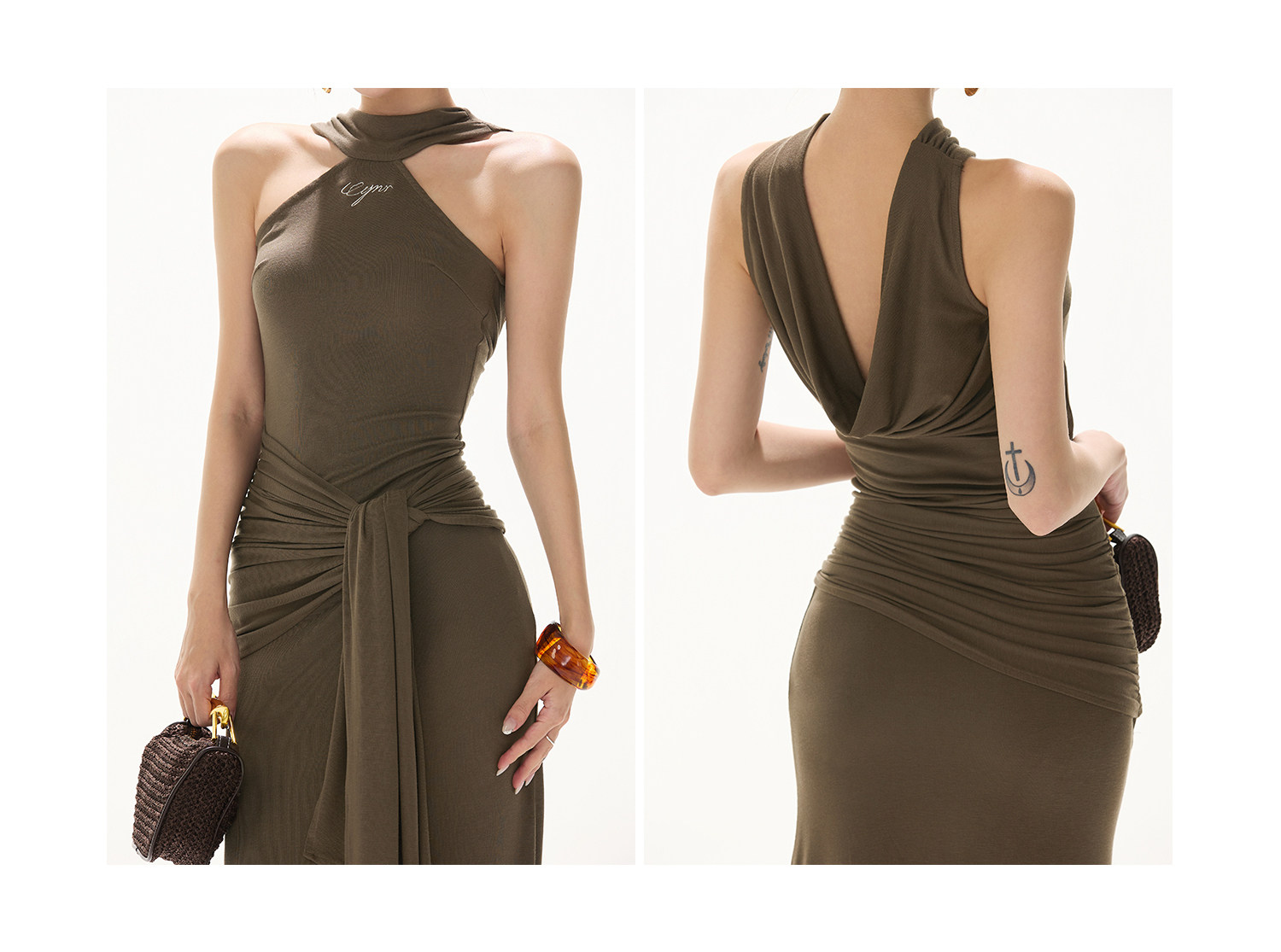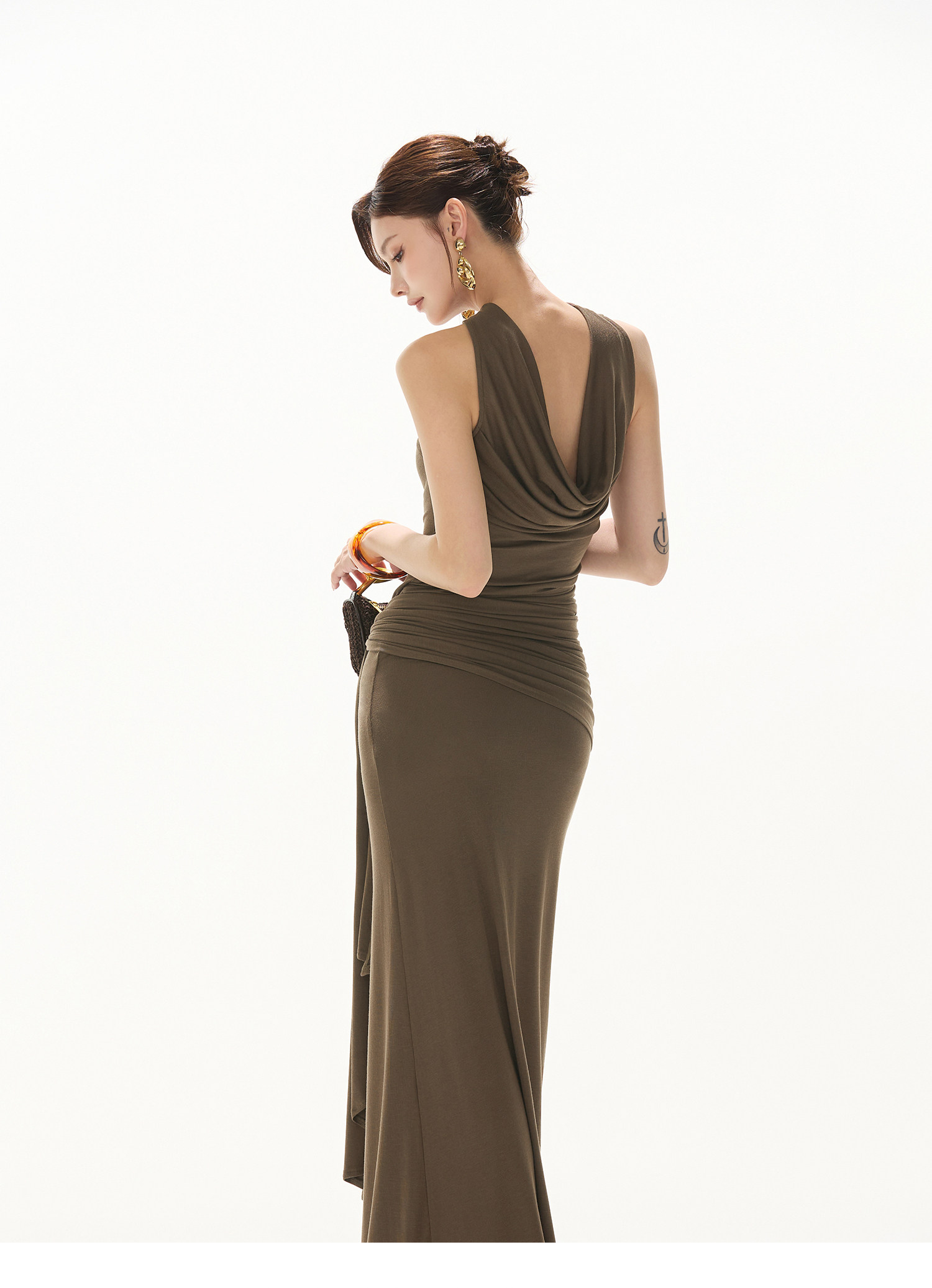RessaLina Olive Green Drapey Neckline Dress - Back Slit Hanging Shoulder, Bodycon Midi, Mock Two-Piece