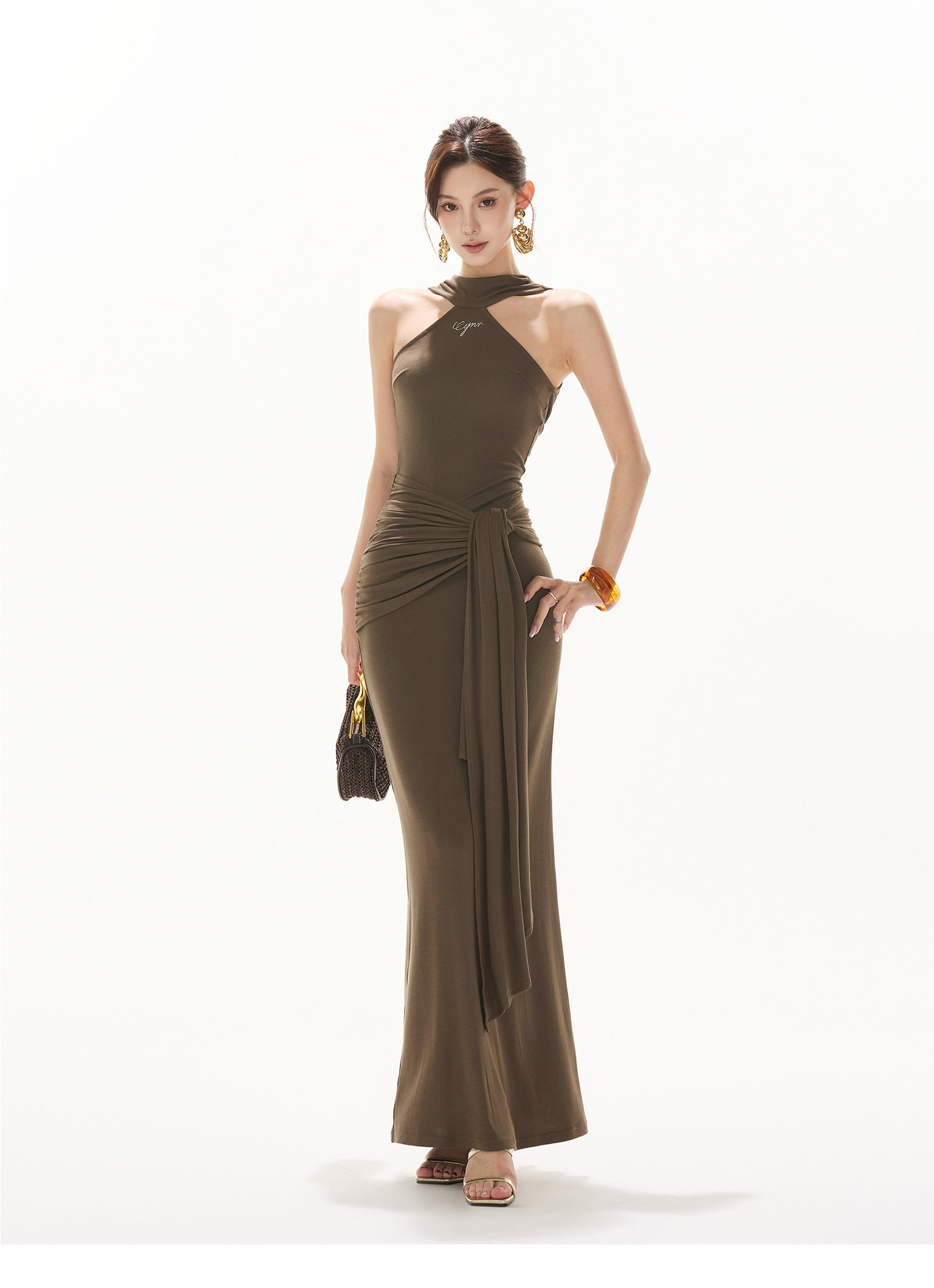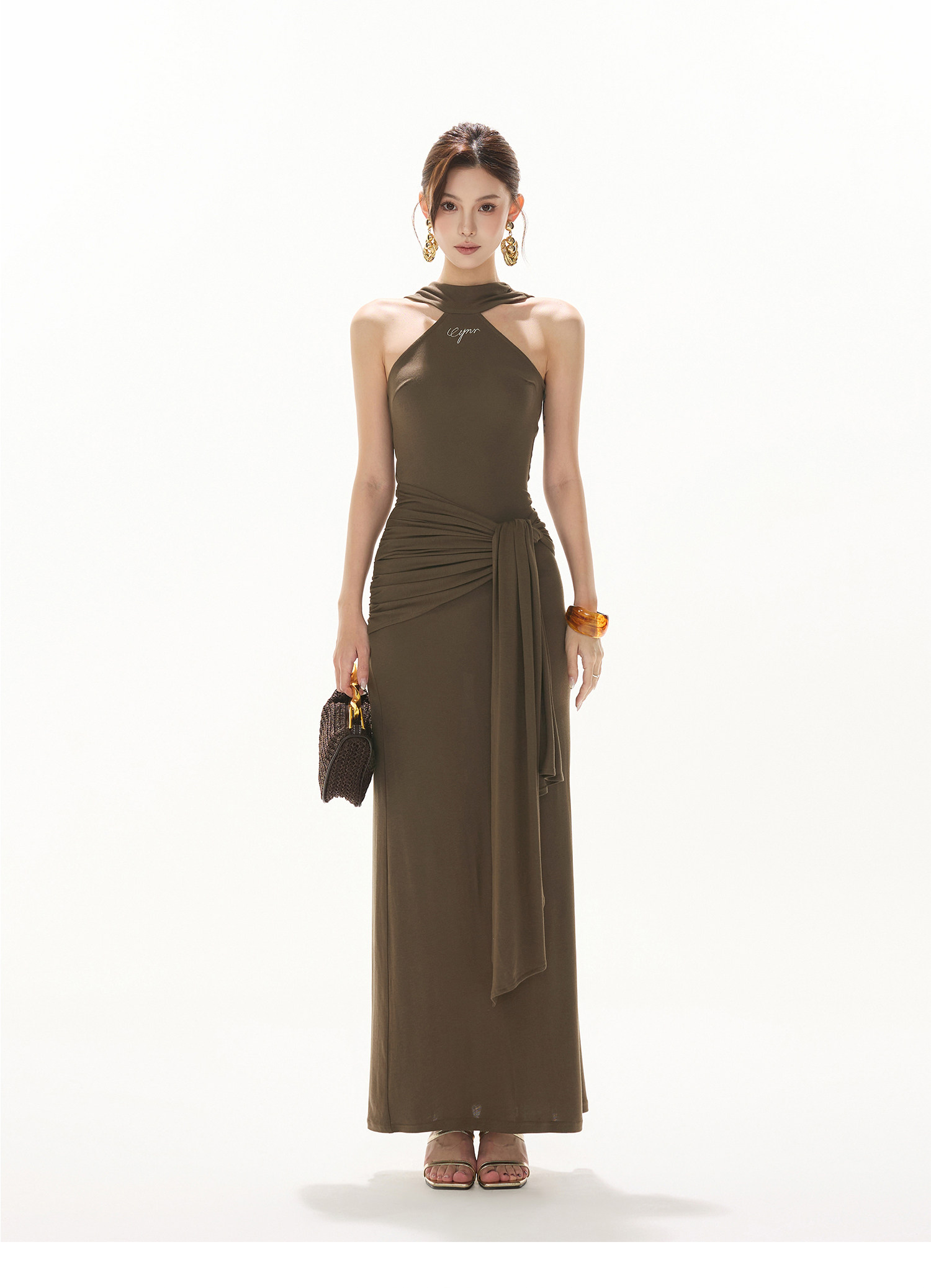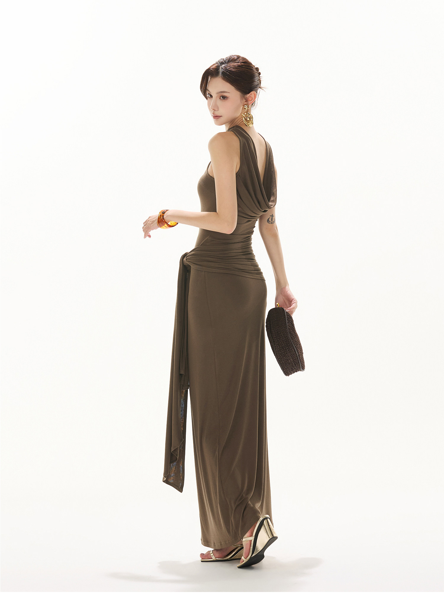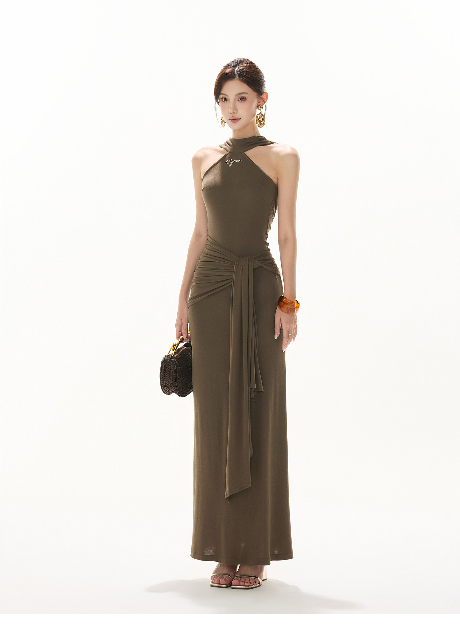 RessaLina Olive Green Drapey Neckline Dress - Back Slit Hanging Shoulder, Bodycon Midi, Mock Two-Piece