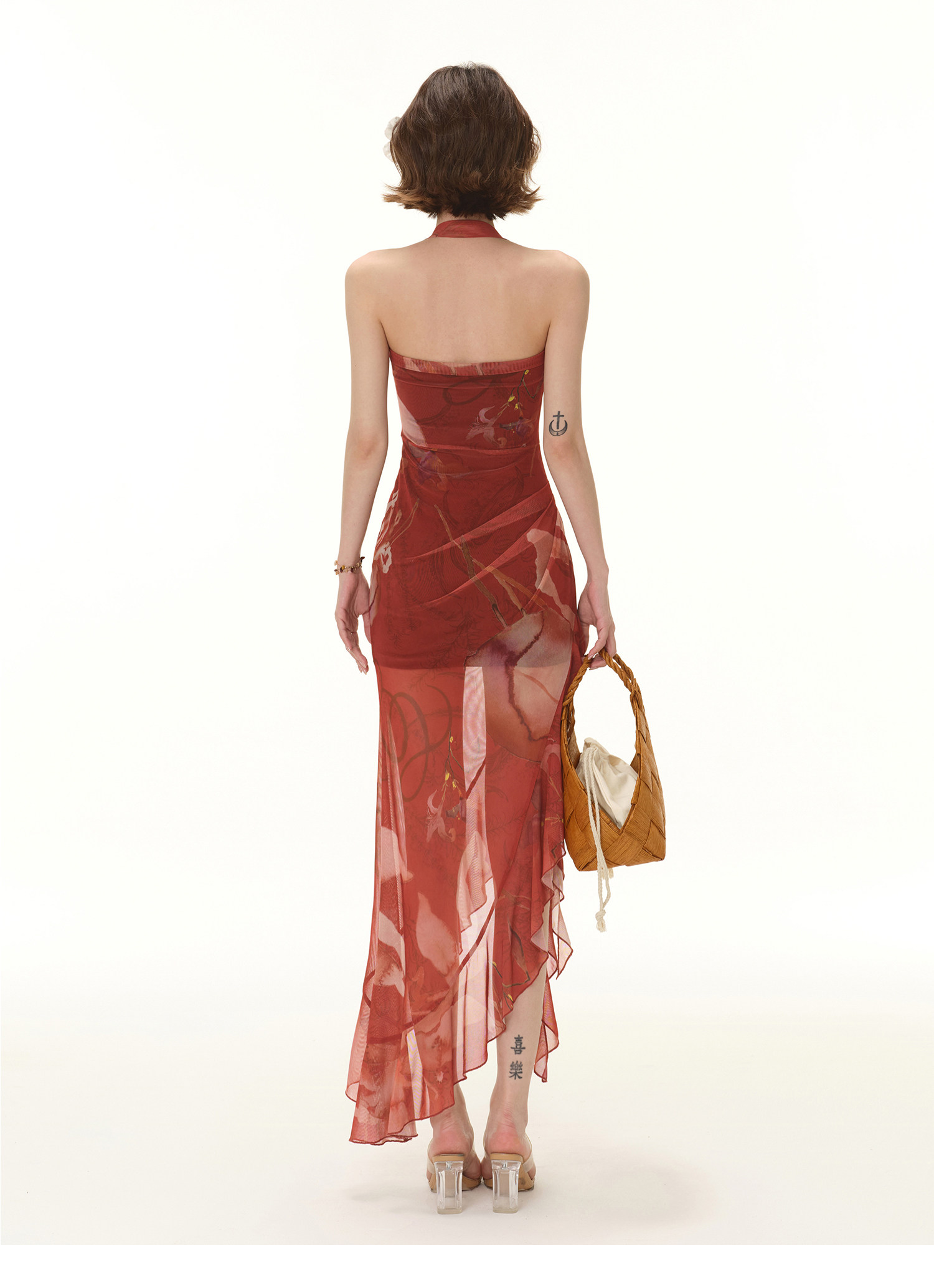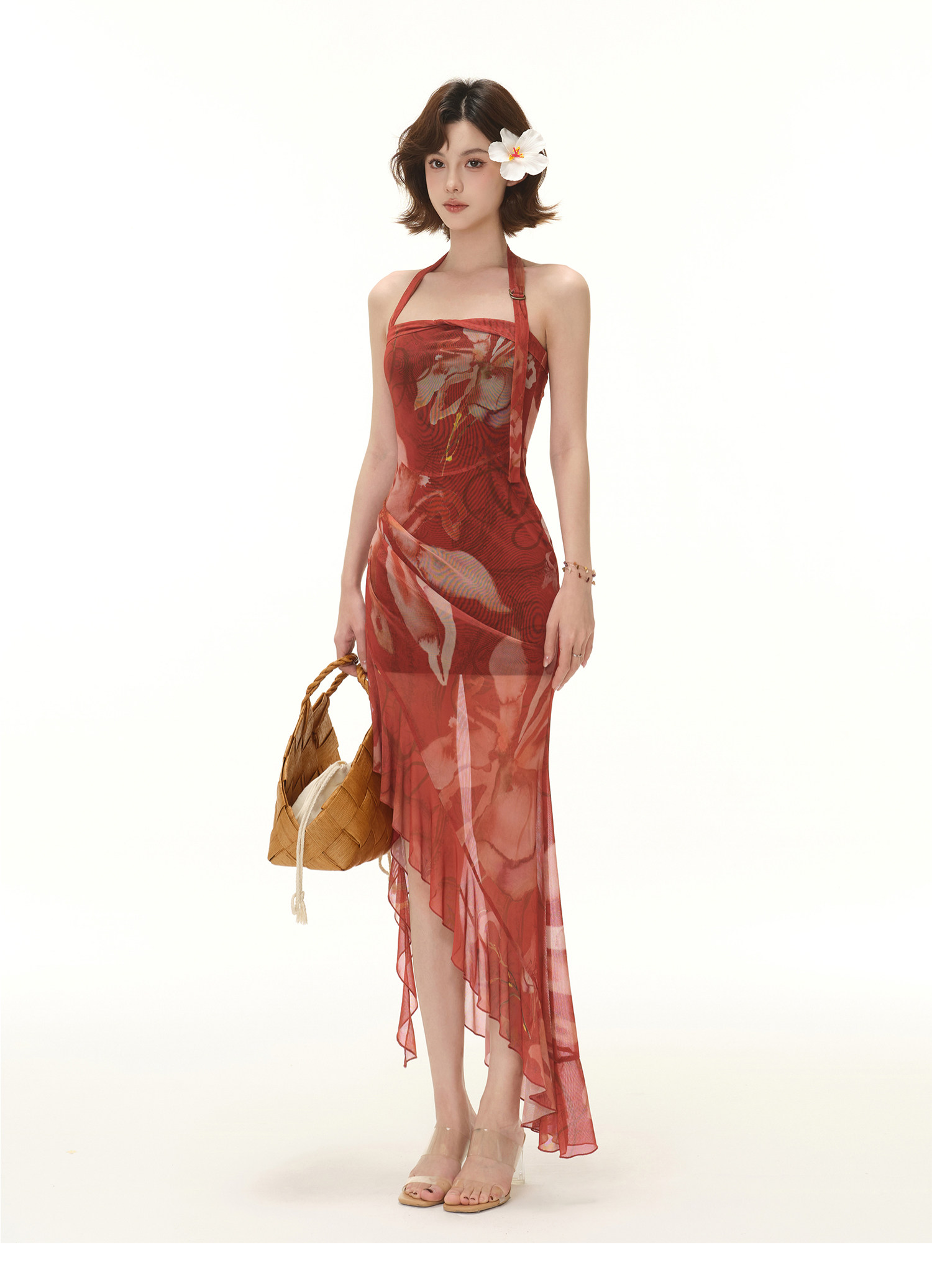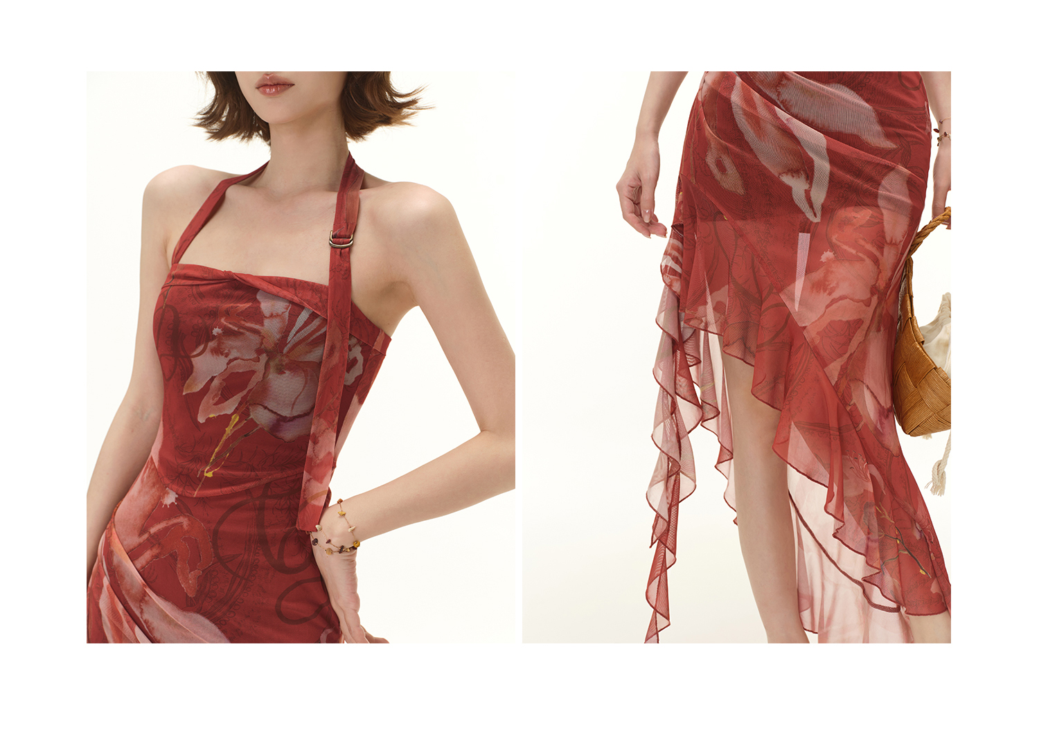 RessaLina Red Embroidered Net Slit Shoulder Dress - Layered Pleats, Water Ripple Hem