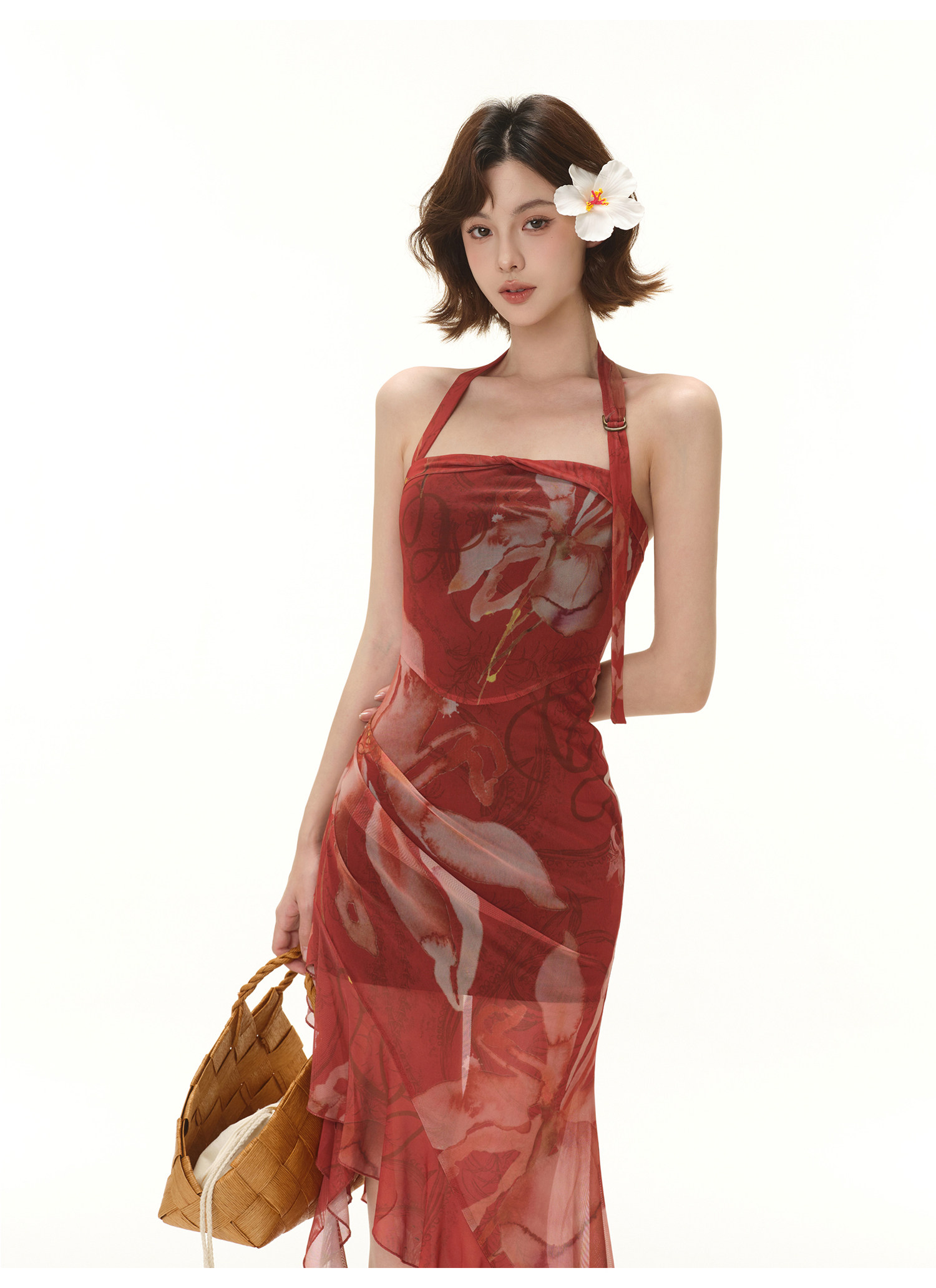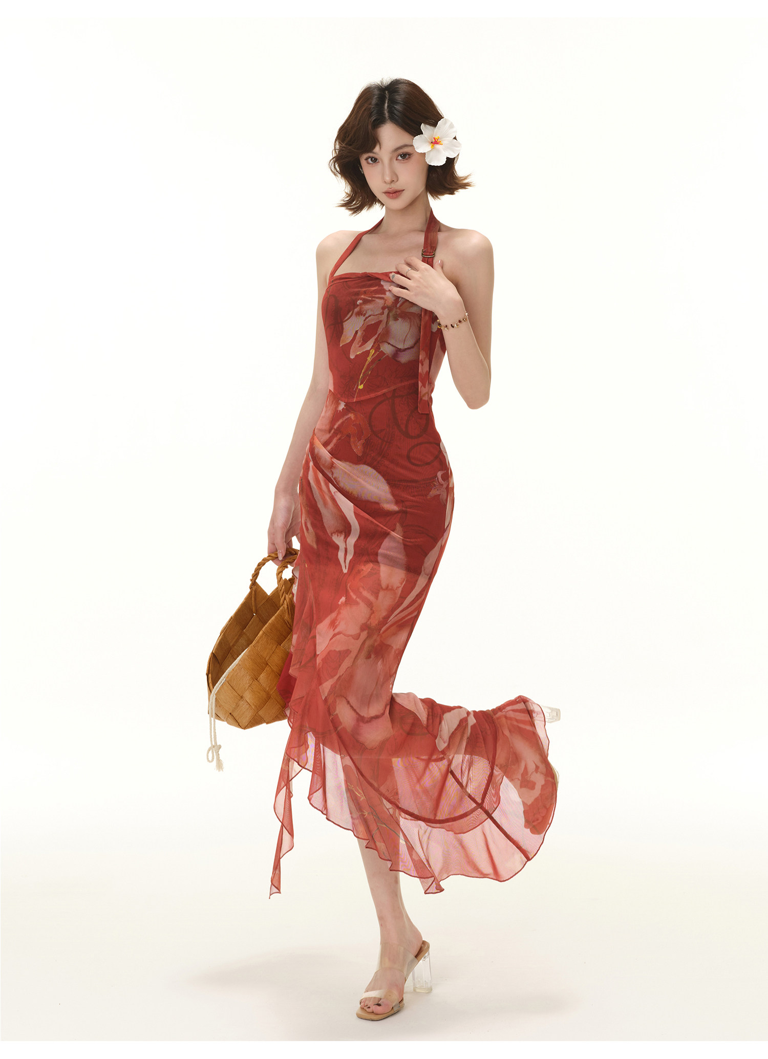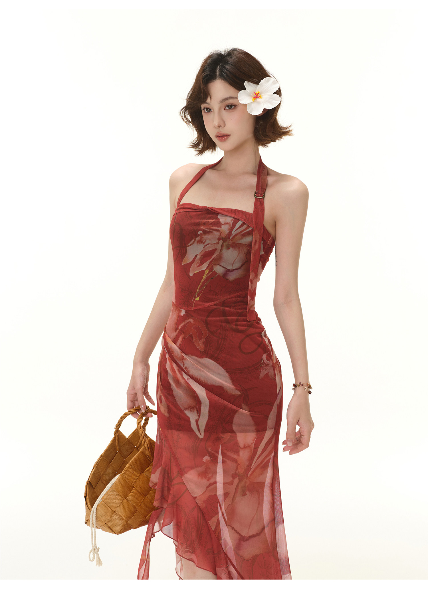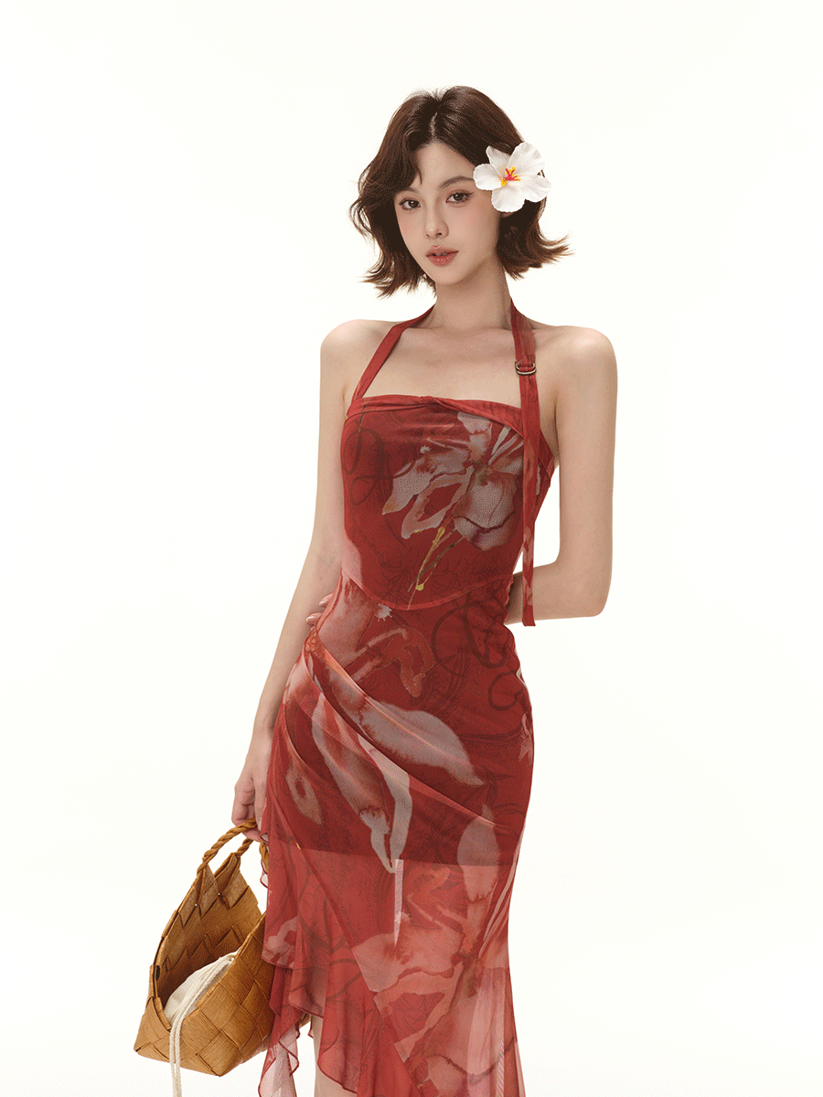 RessaLina Red Embroidered Net Slit Shoulder Dress - Layered Pleats, Water Ripple Hem