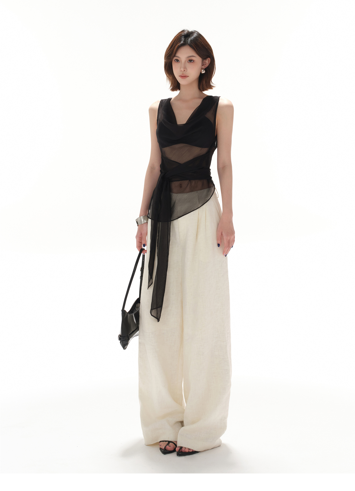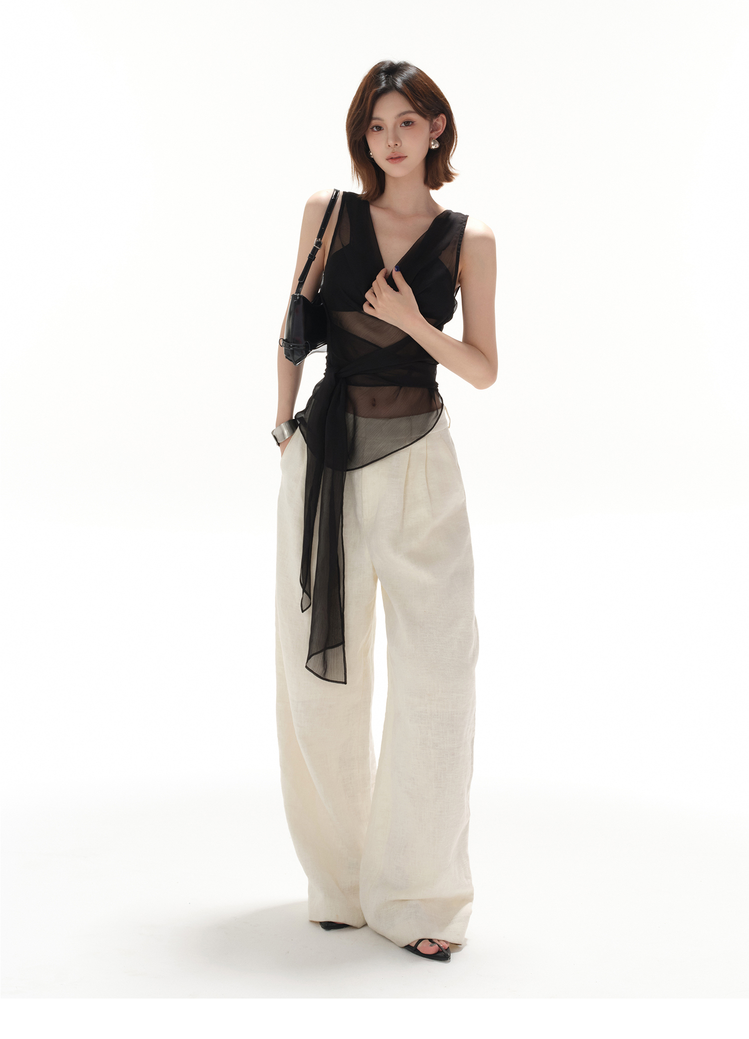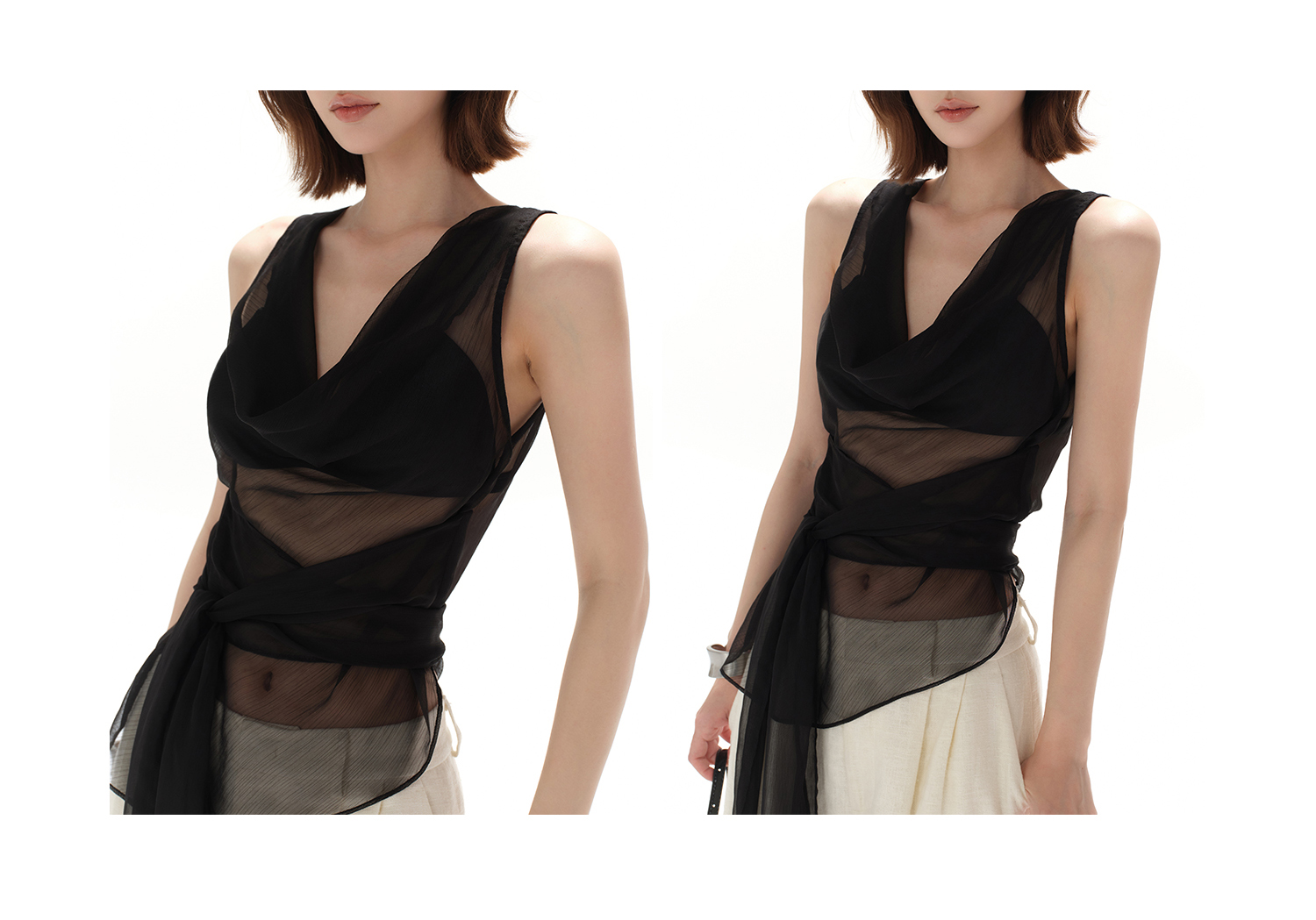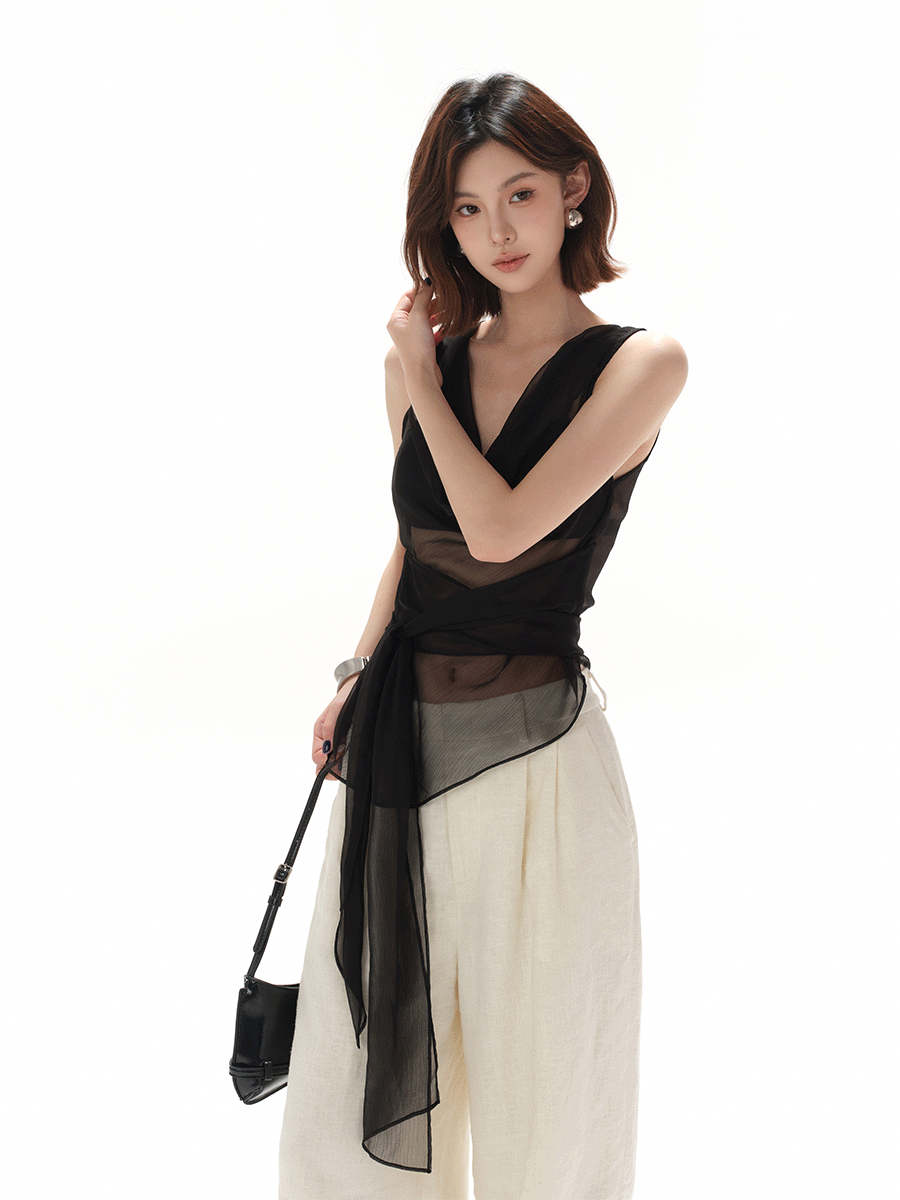CYNR original design smart office lady swinging collar sexy simple lace-up waist perspective hot girl top