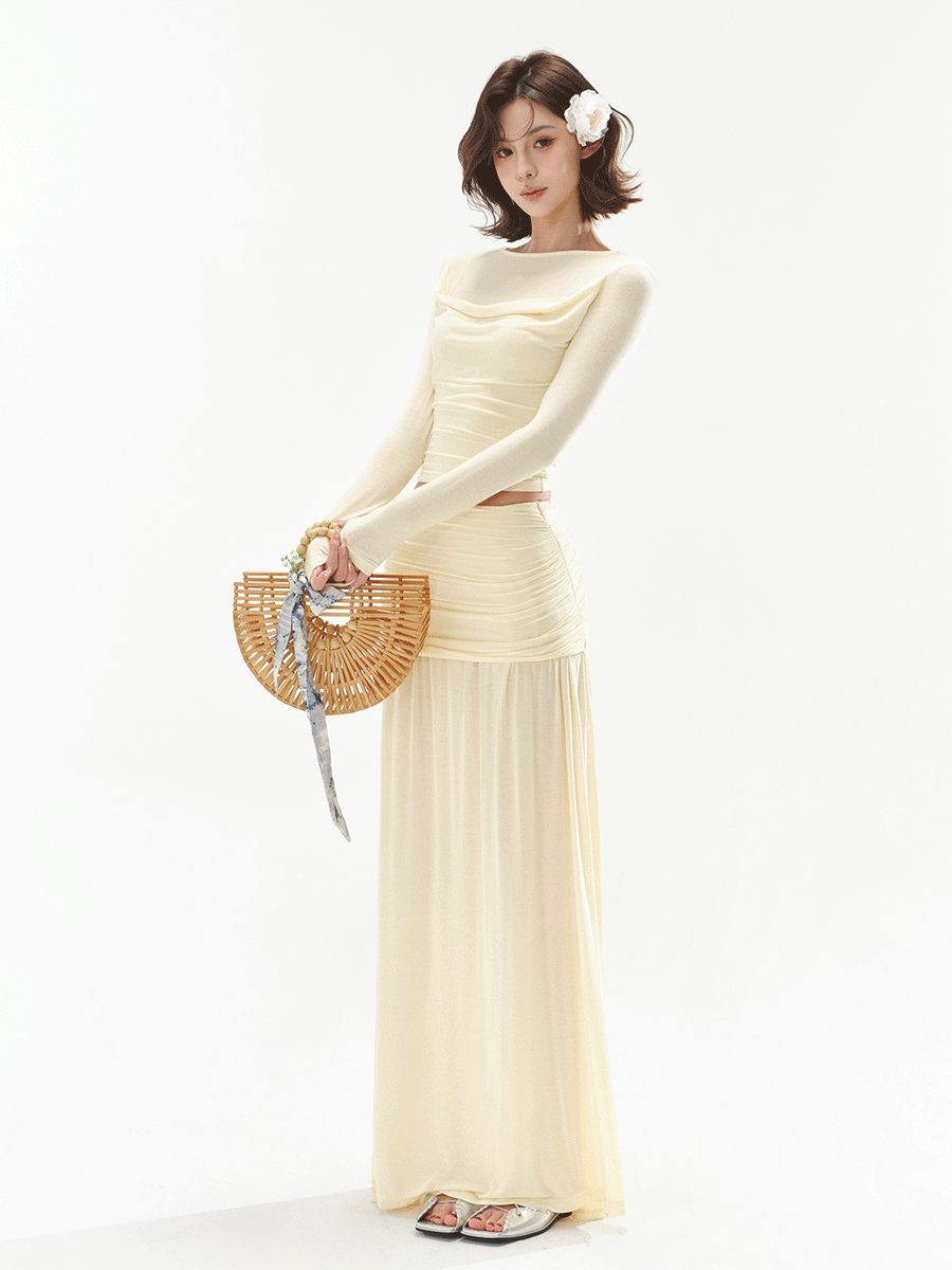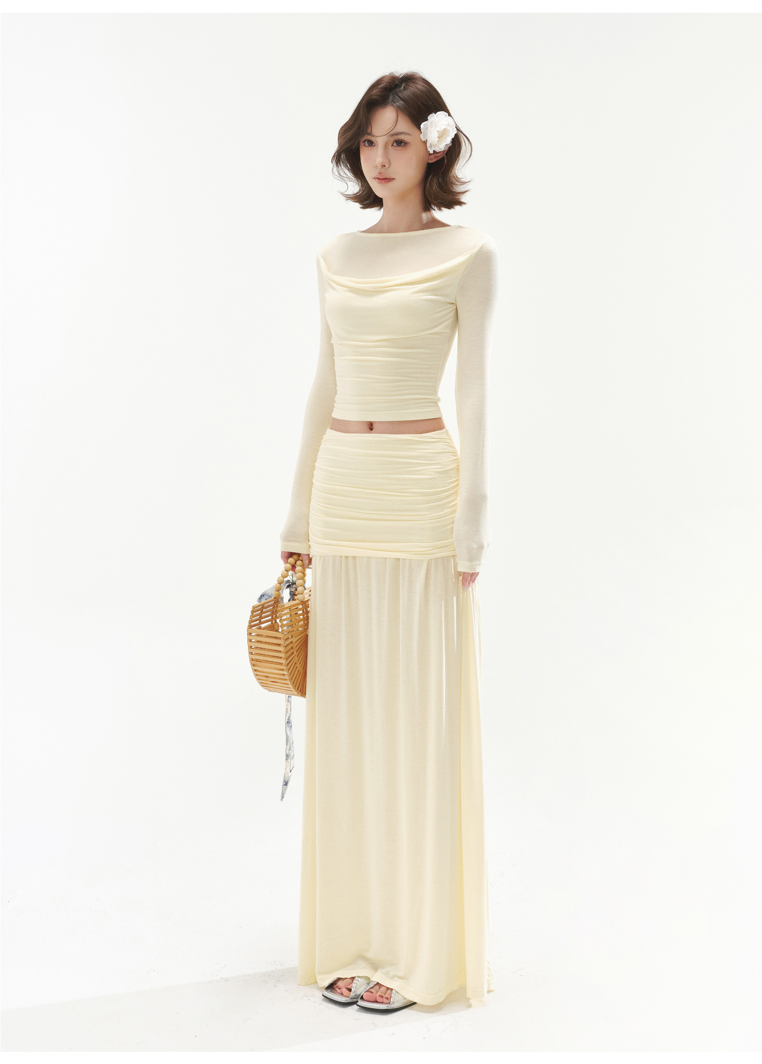 RessaLina Women's Drape Neck Cropped Top & Pleated Midi Skirt Set - Lazy Casual Spicy Outfit