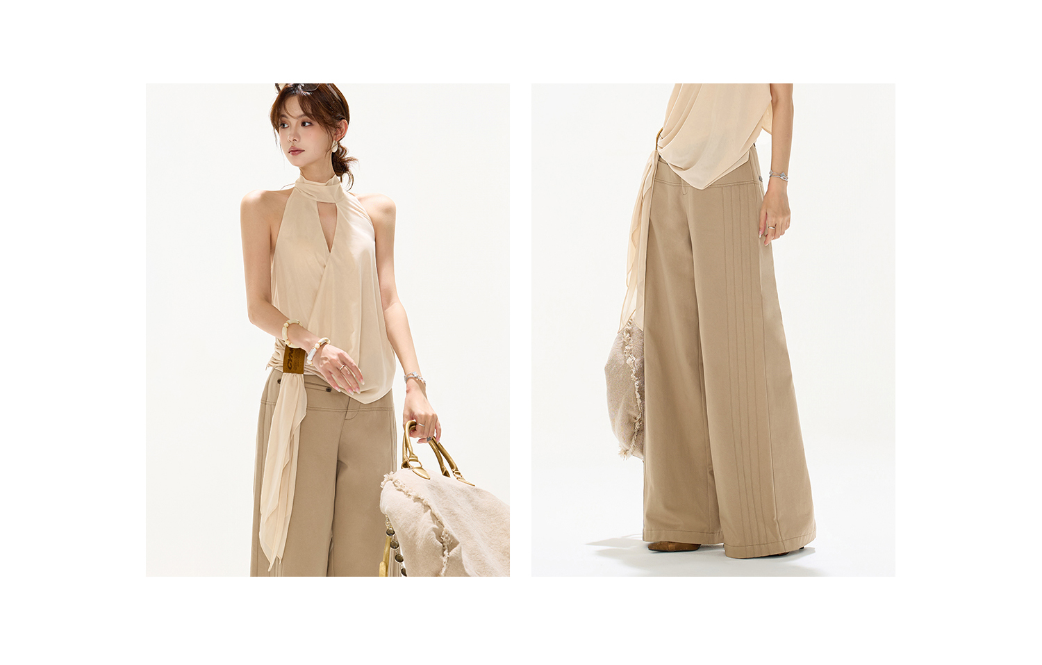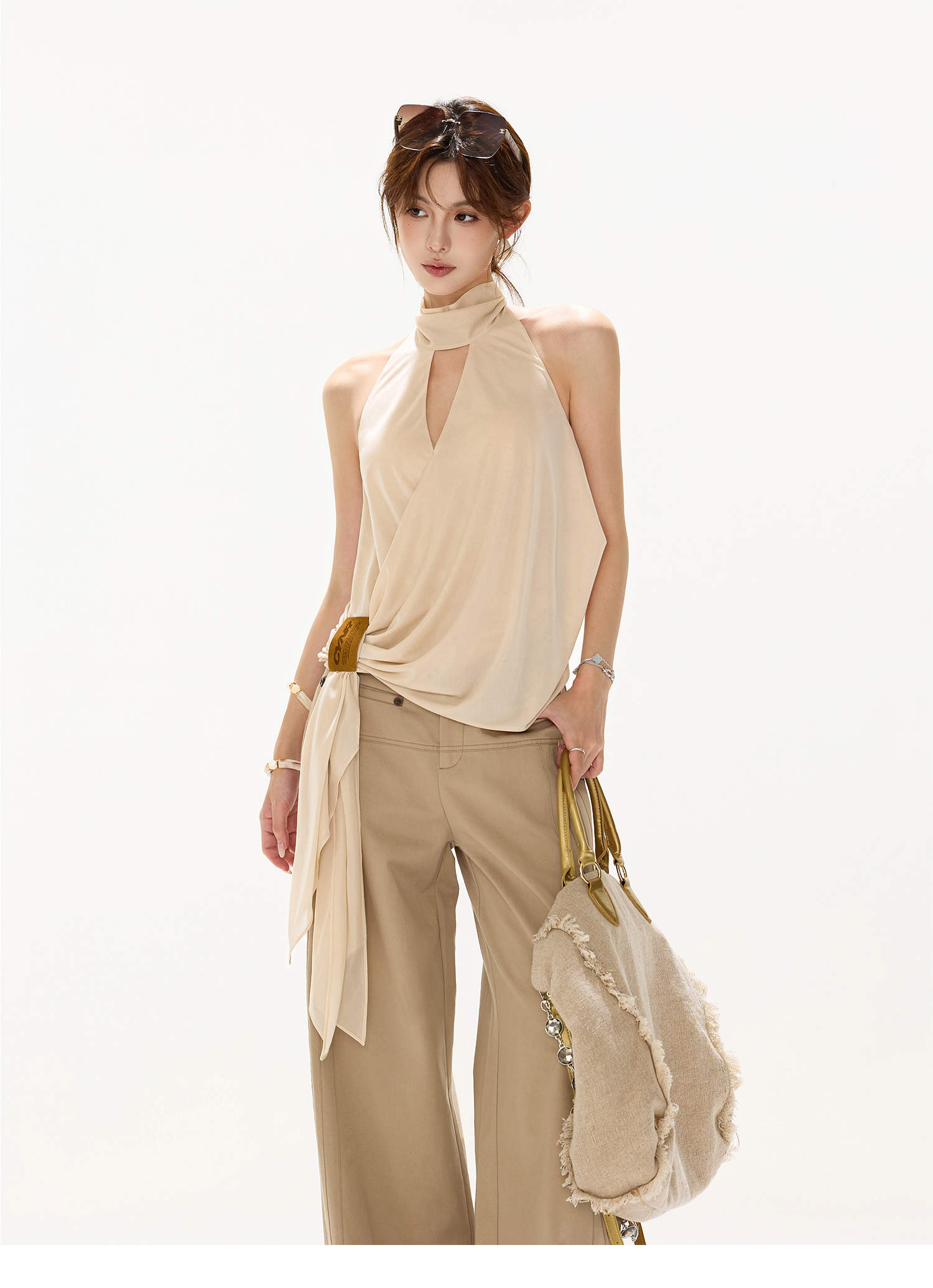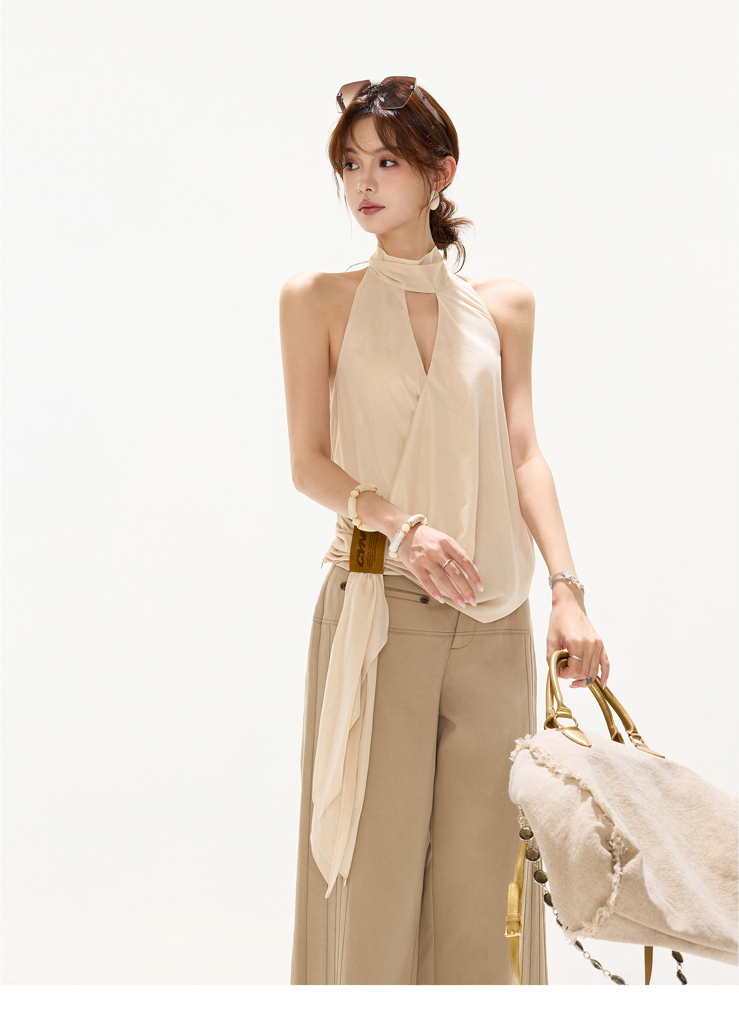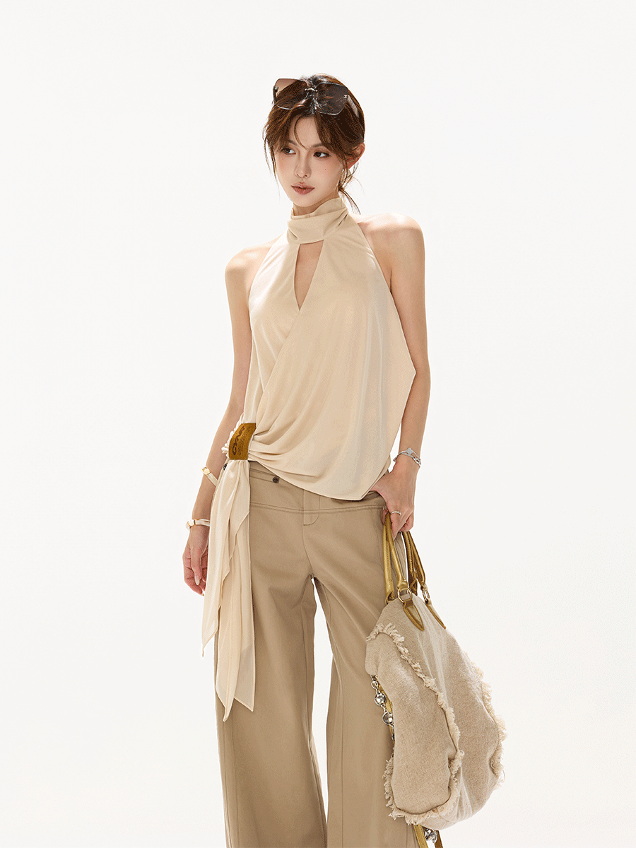 RessaLina Women's Drape Neck Cross Tie Tank - Light Apricot Cropped V-Neck, 100% Polyester
