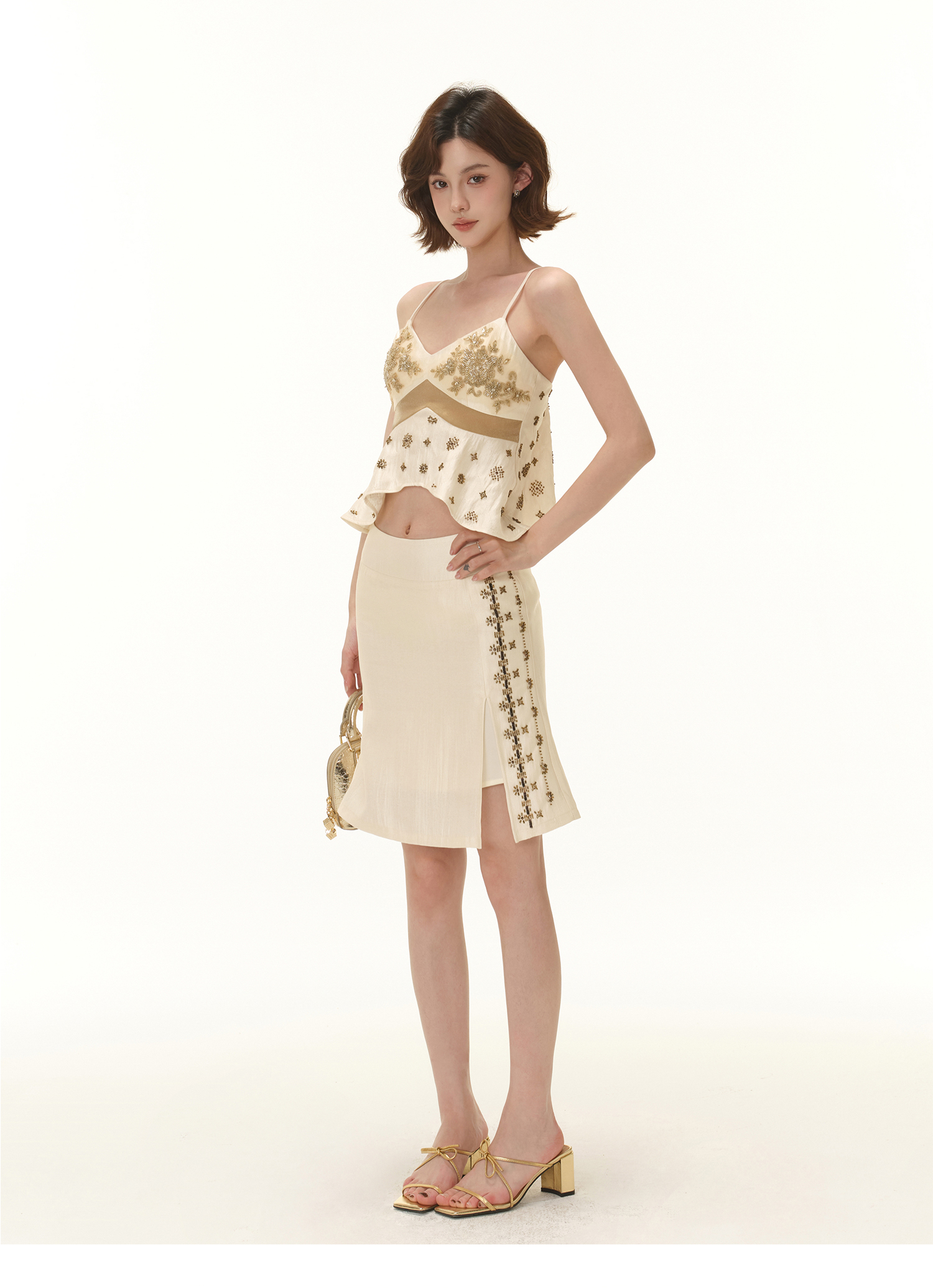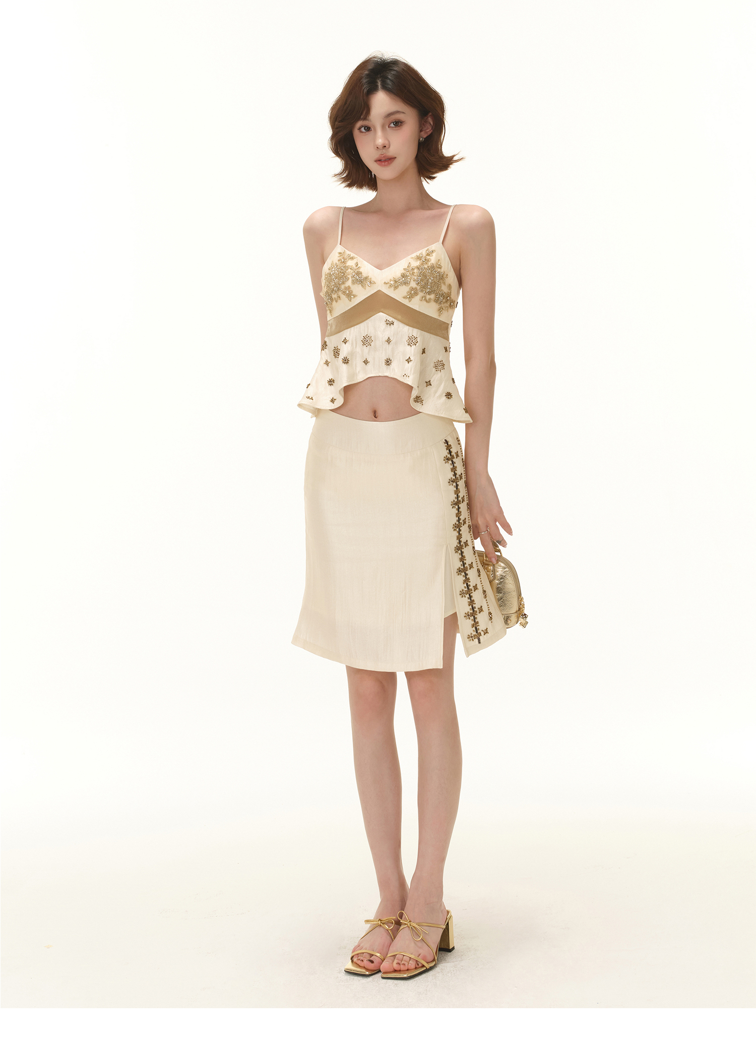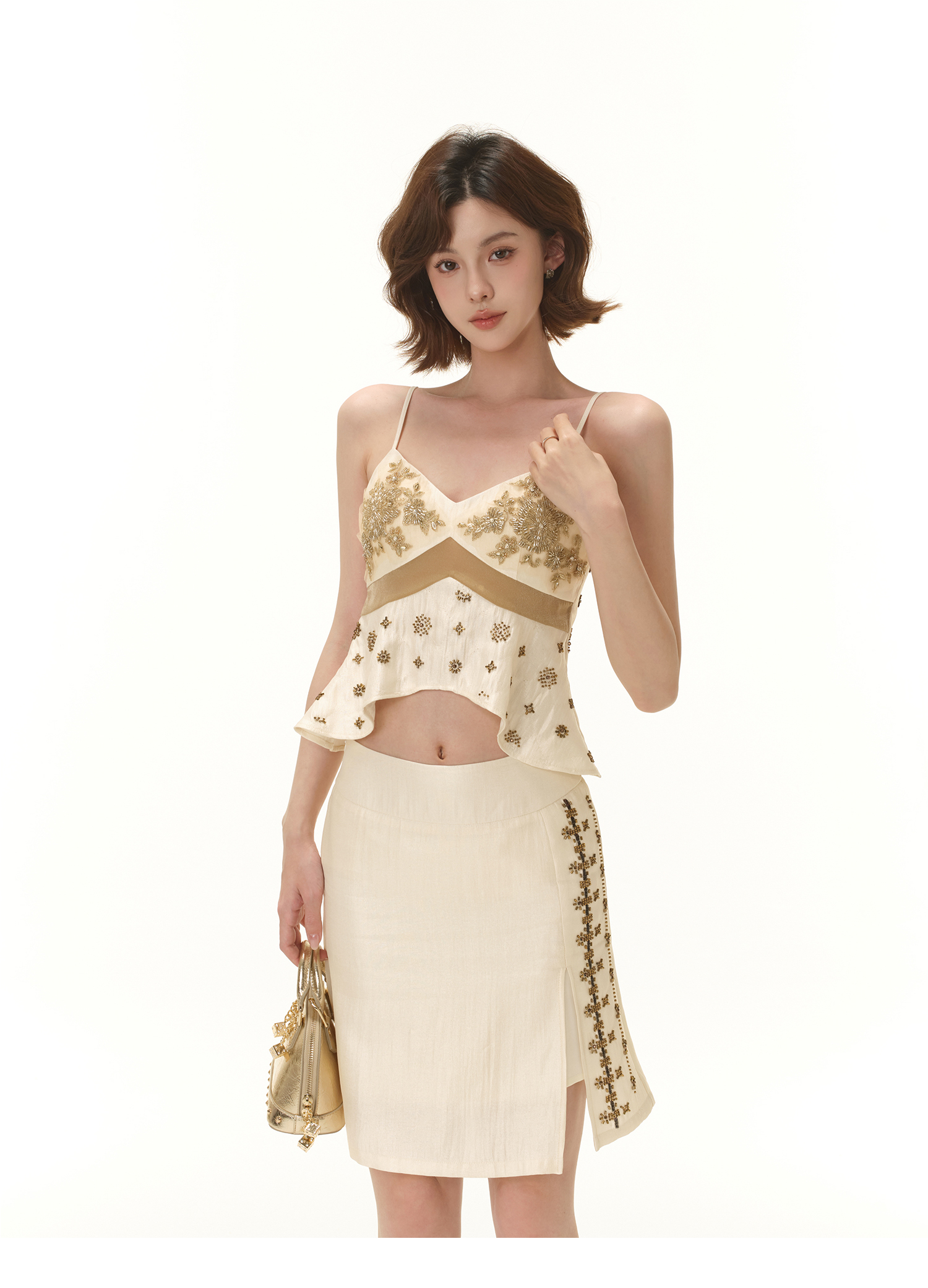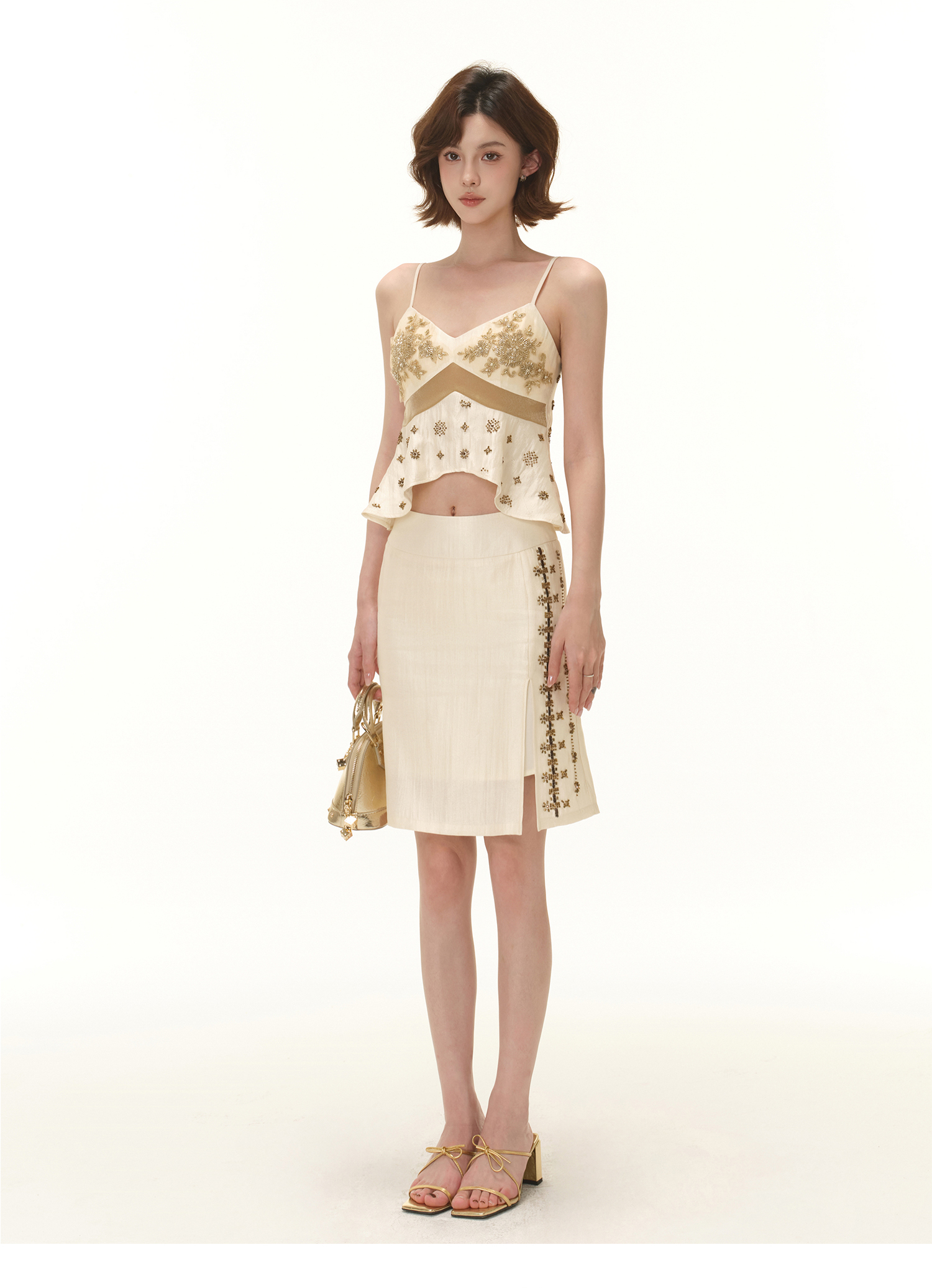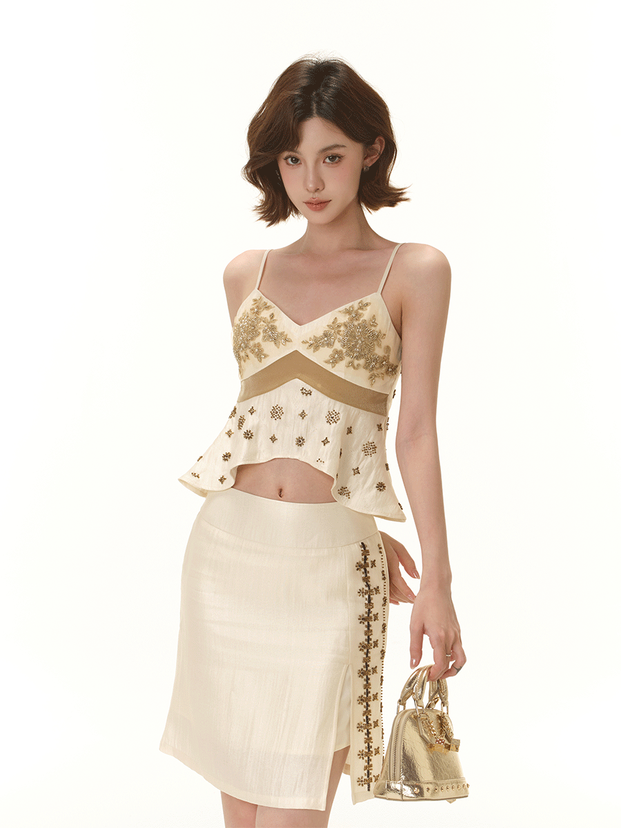 RessaLina Women's Embroidered Beaded Cropped Tank - Gold Floral, Adjustable Strap, White Gold
