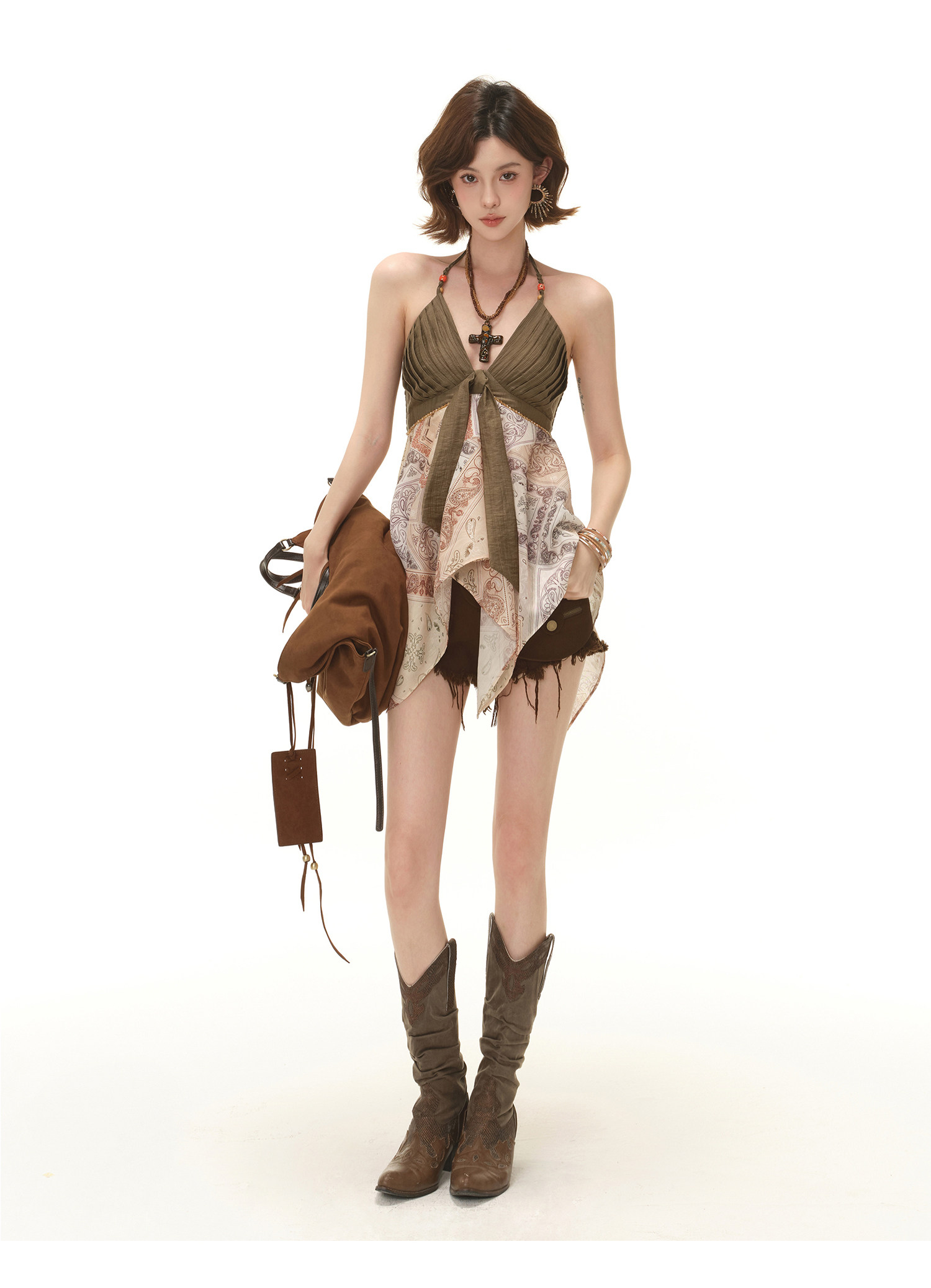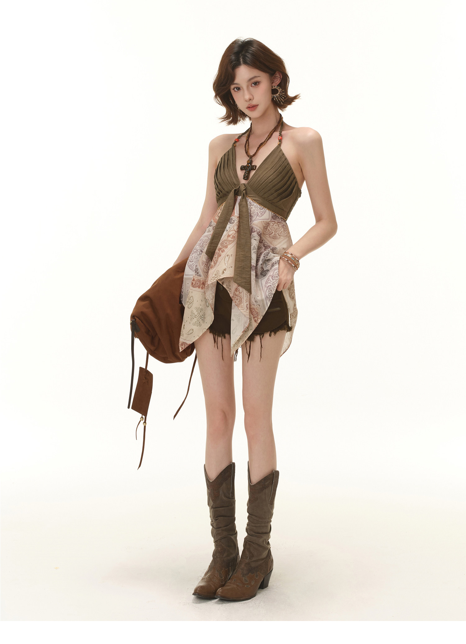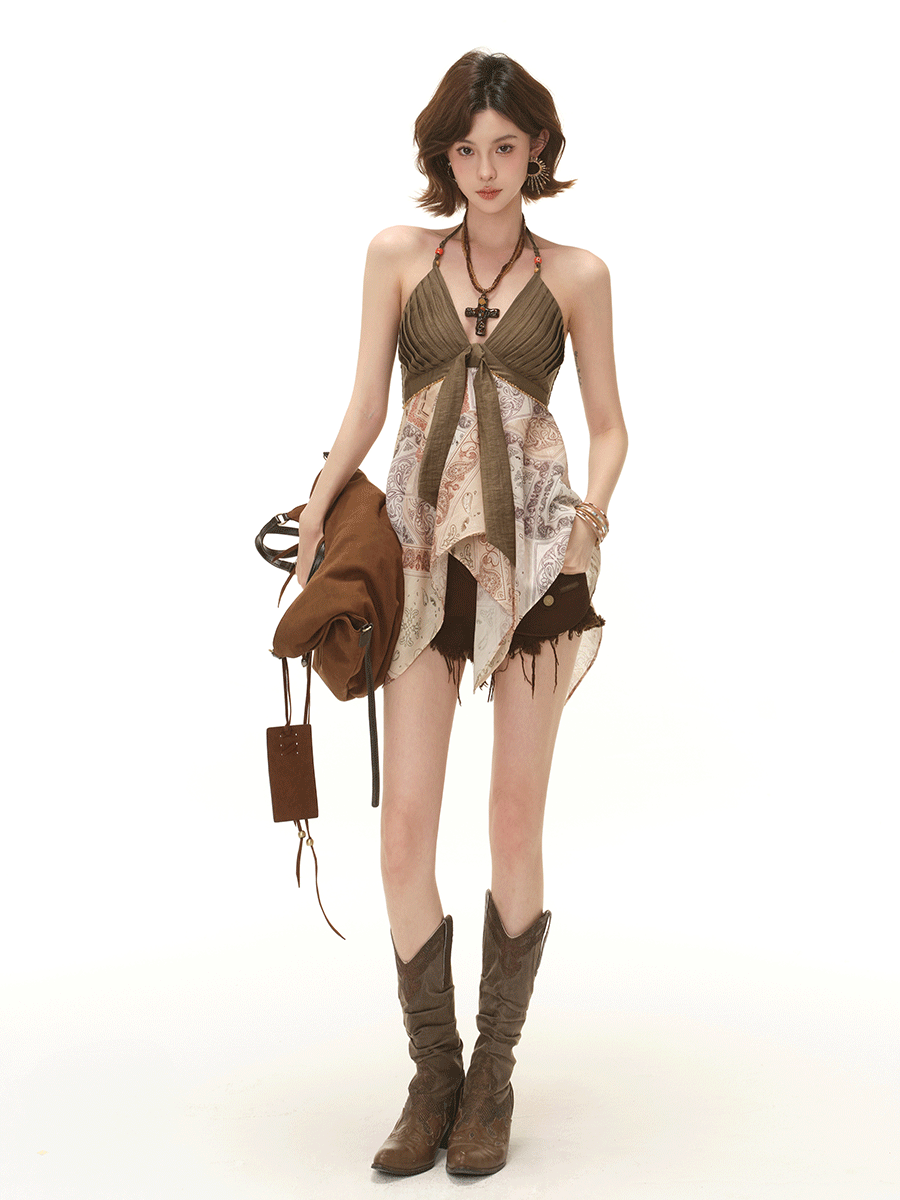 RessaLina Women's Tie Front Tank Top - Boho Cropped V-Neck with Pleated Skirt Hem, Earth Tone