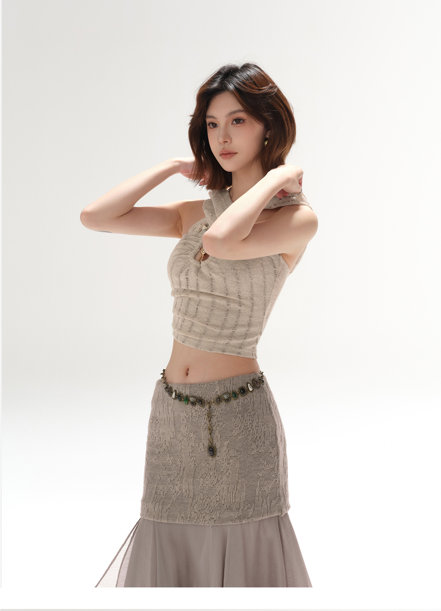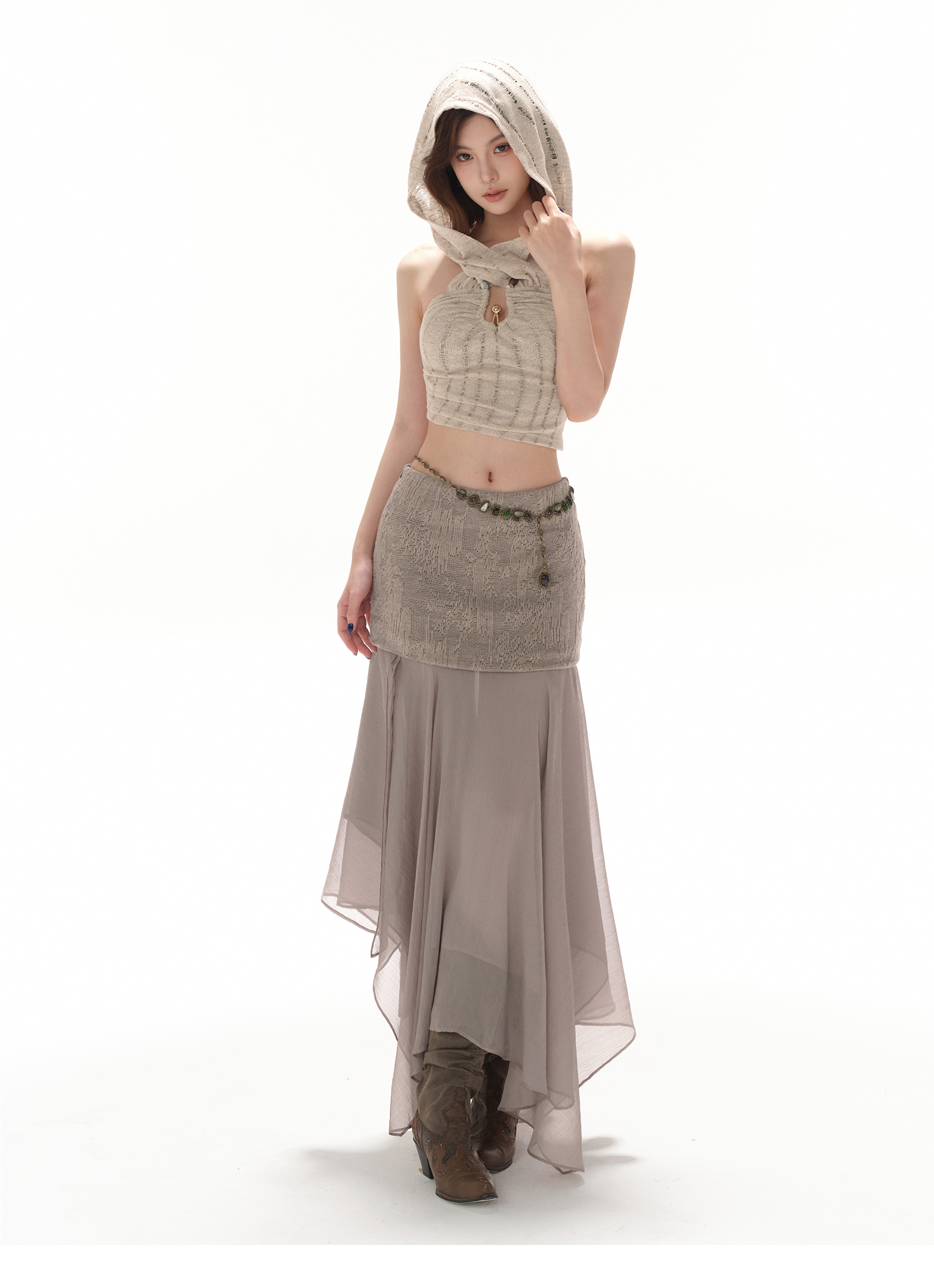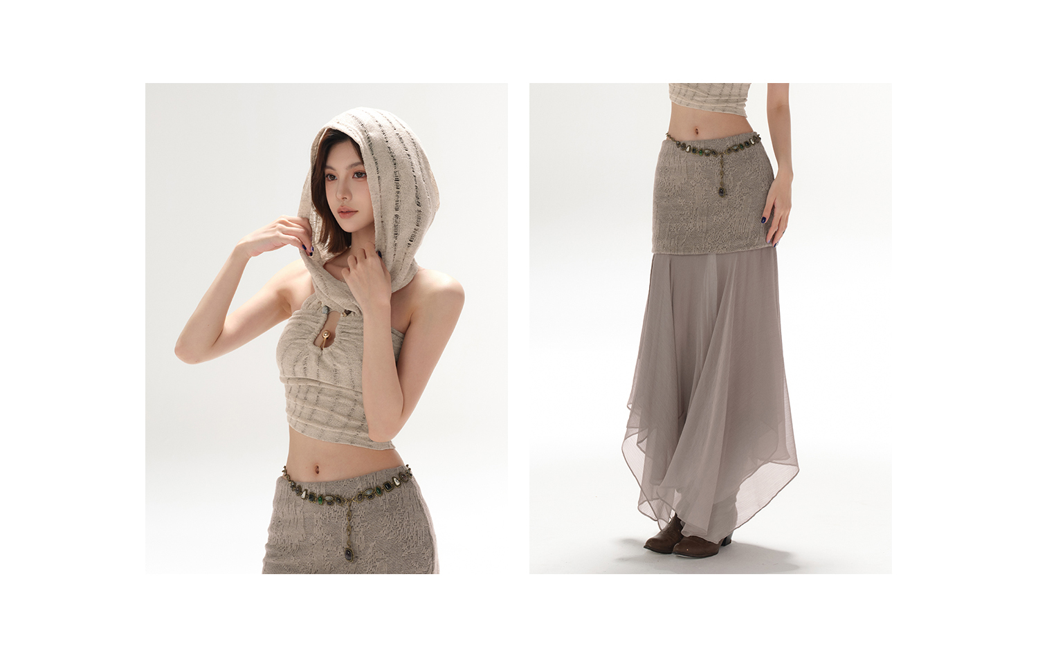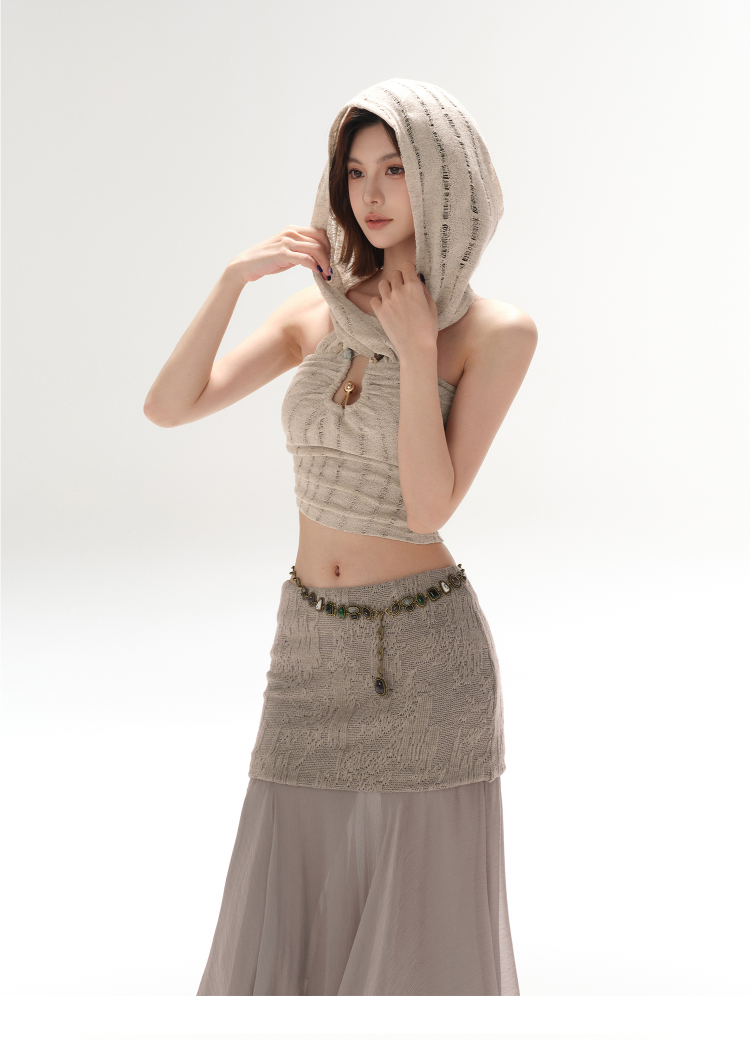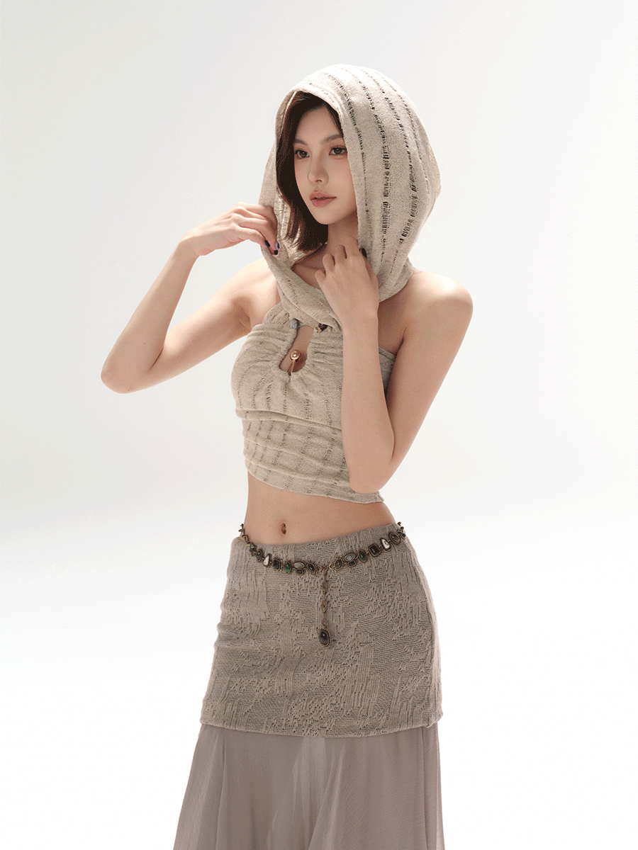 RessaLina Women's U-Neck Beaded Hoodie Crop Top - Cropped Elastic, Lazy Wave Design, Light Khaki