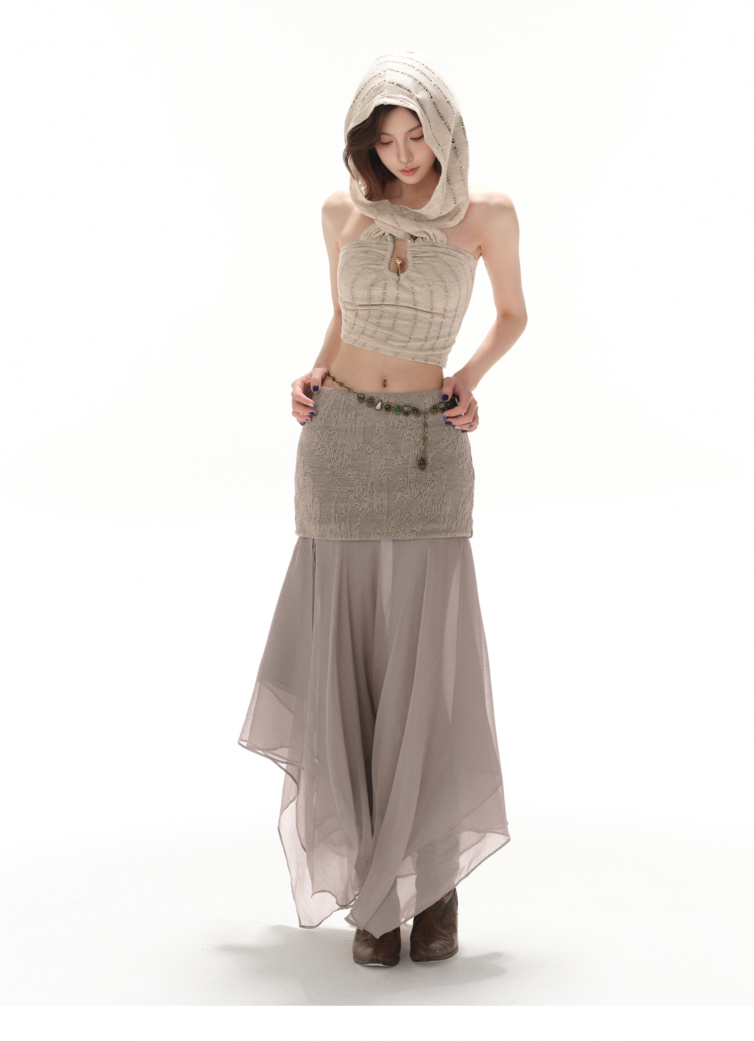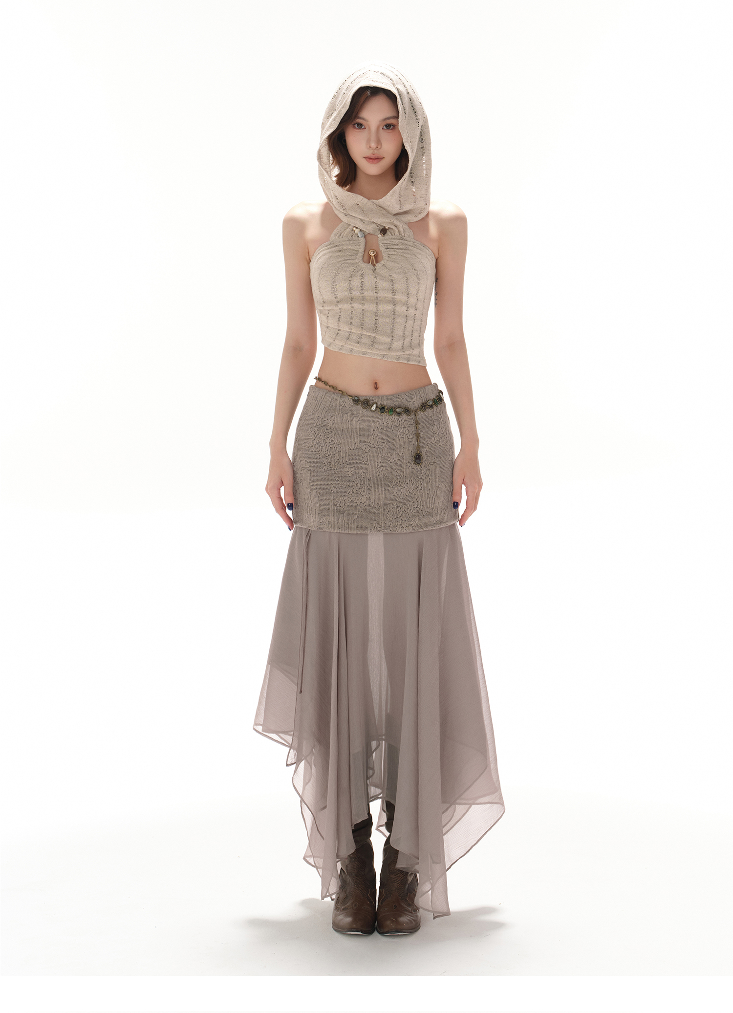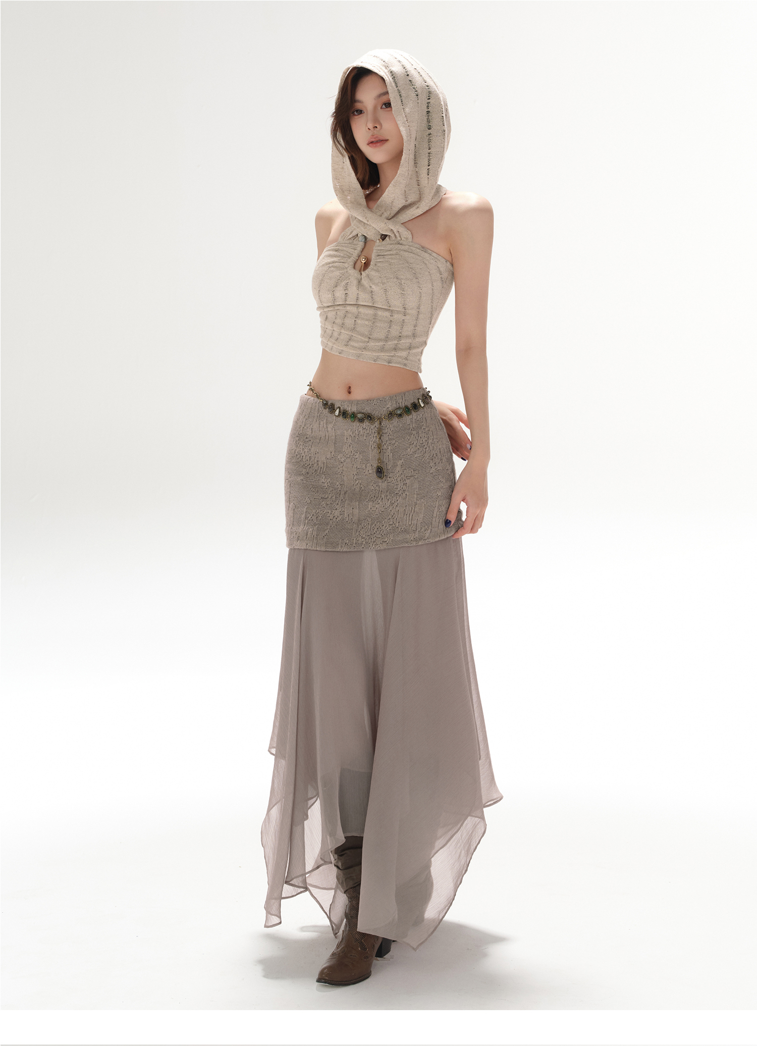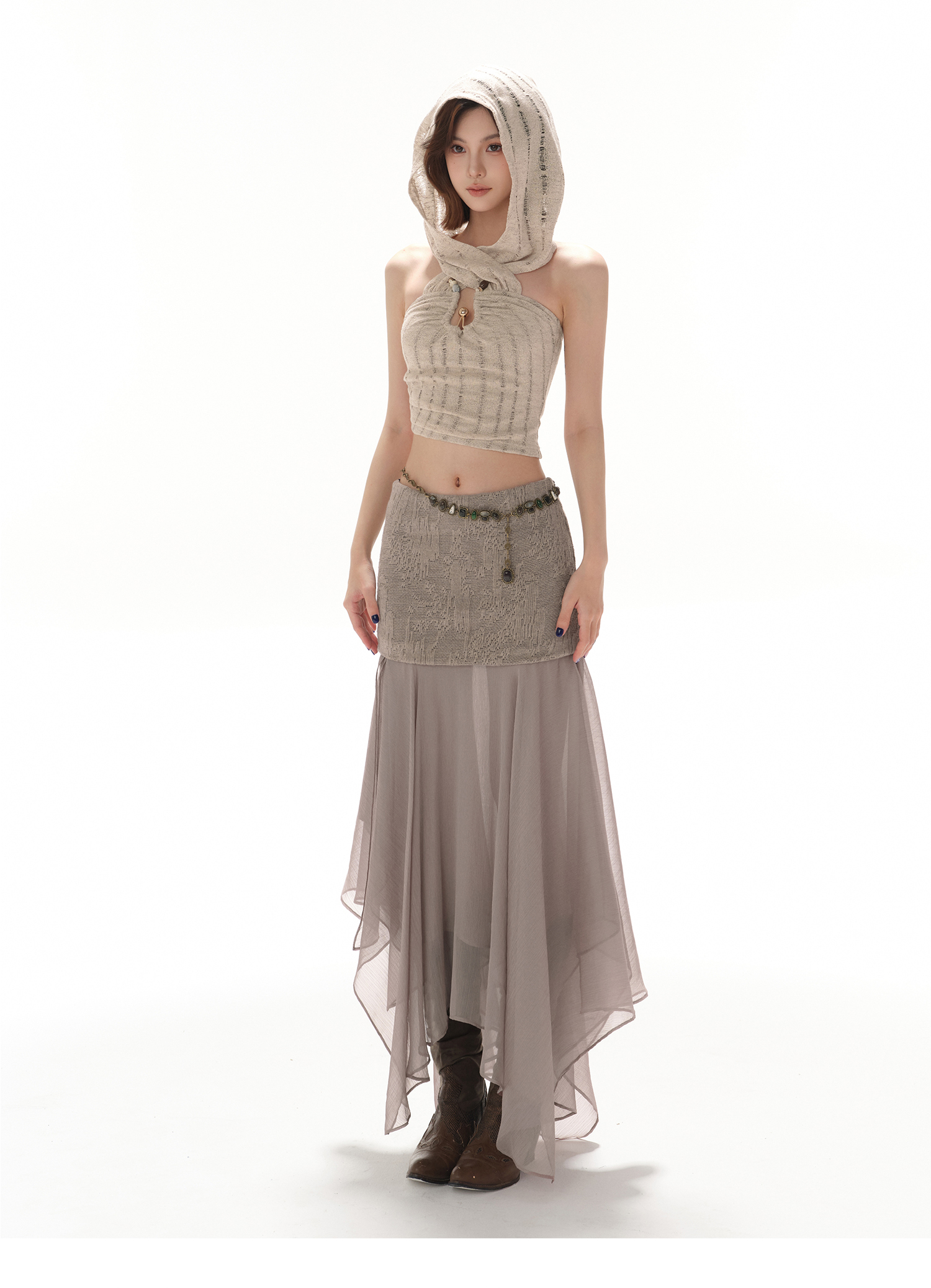 RessaLina Women's U-Neck Beaded Hoodie Crop Top - Cropped Elastic, Lazy Wave Design, Light Khaki