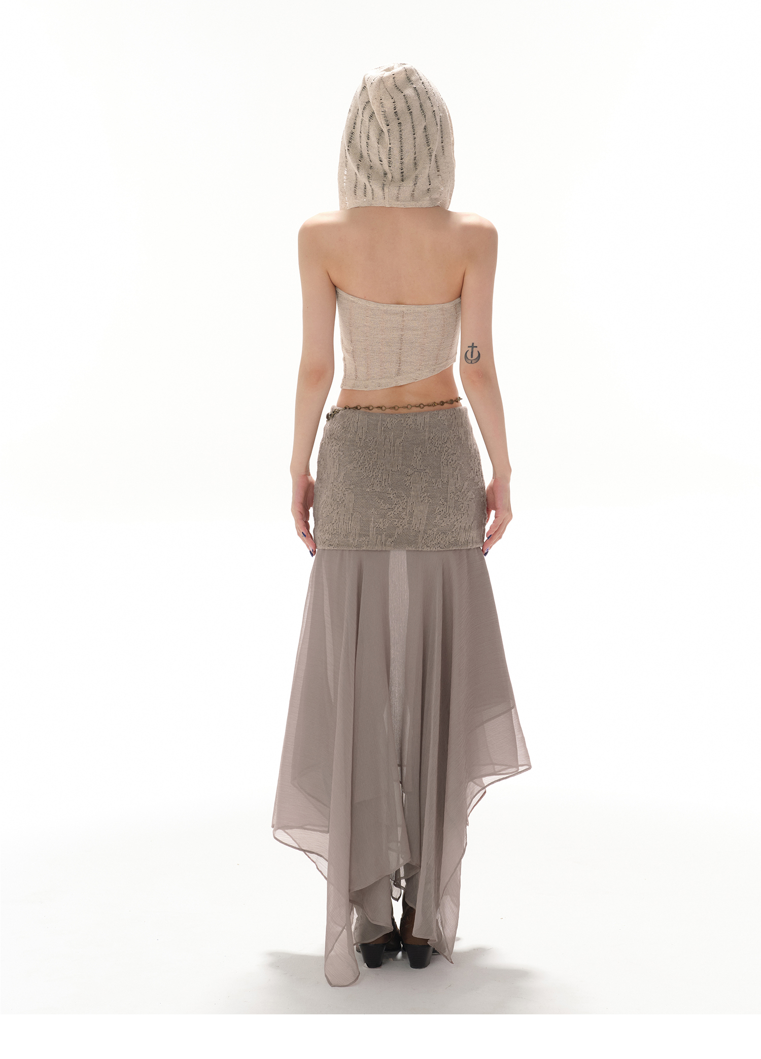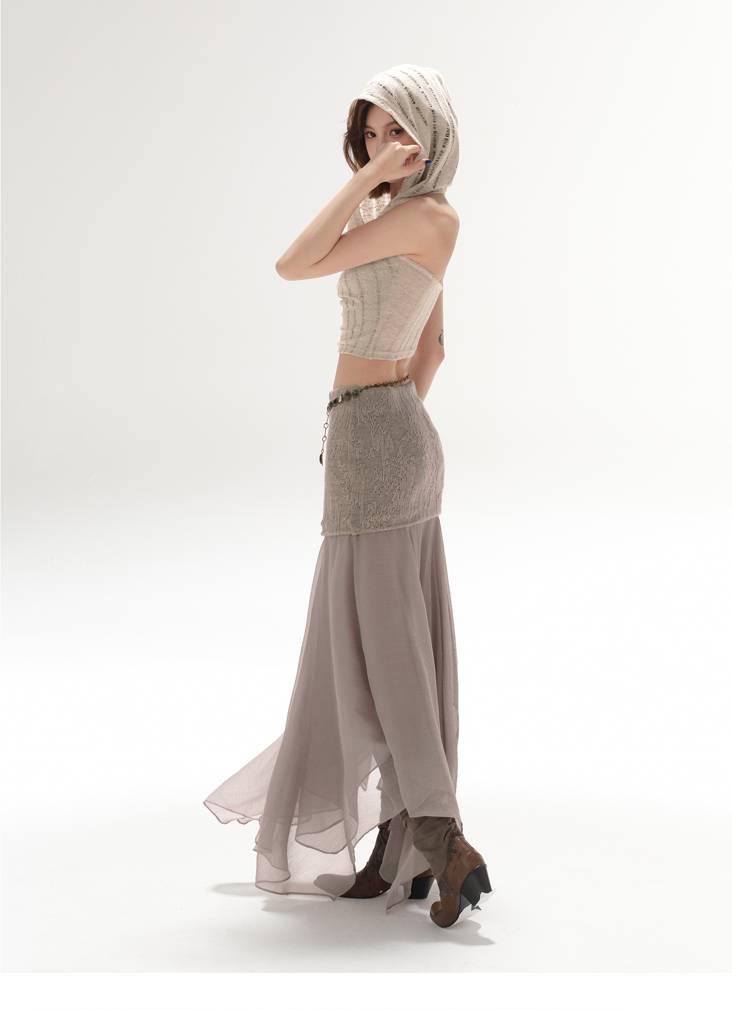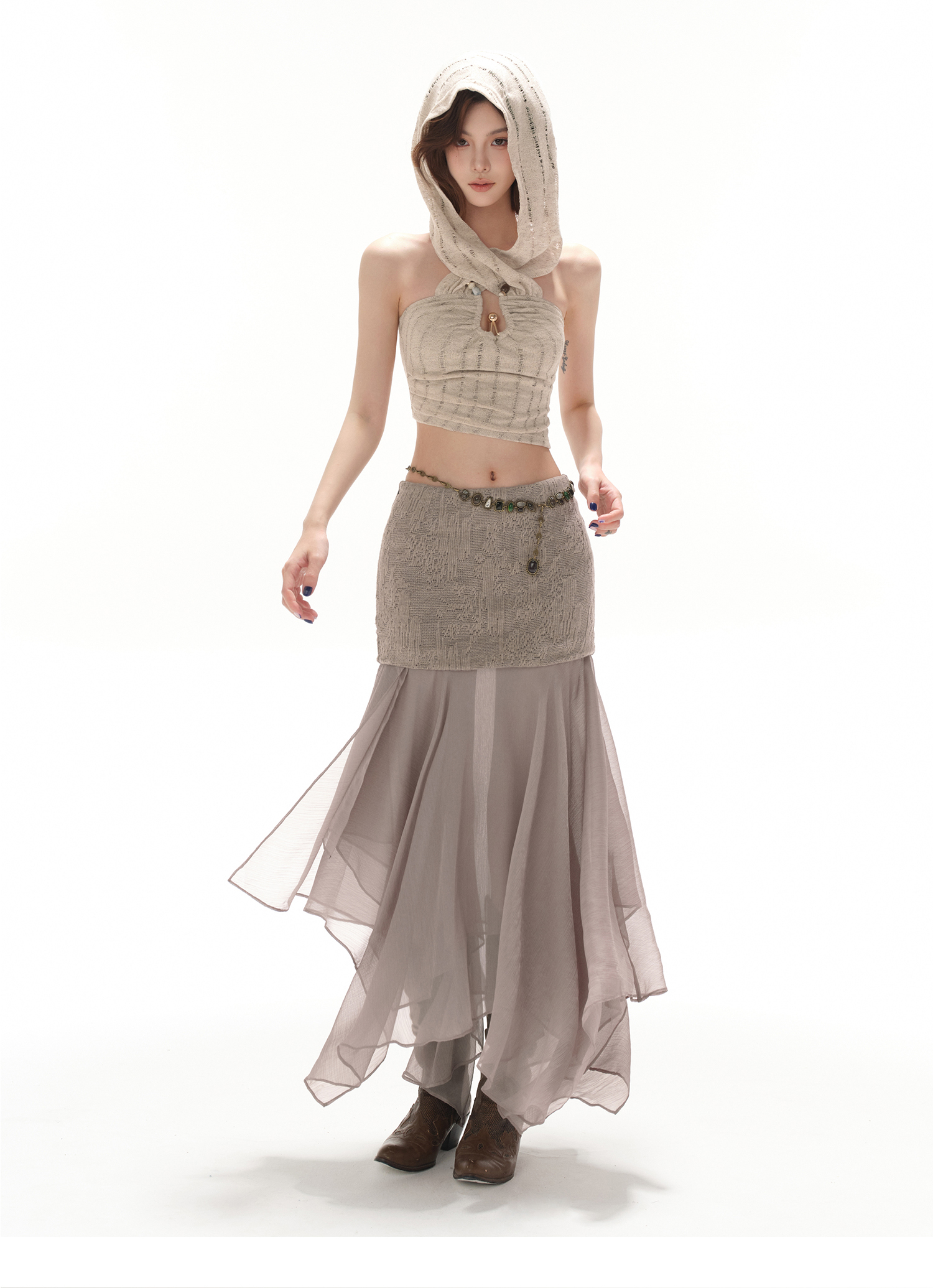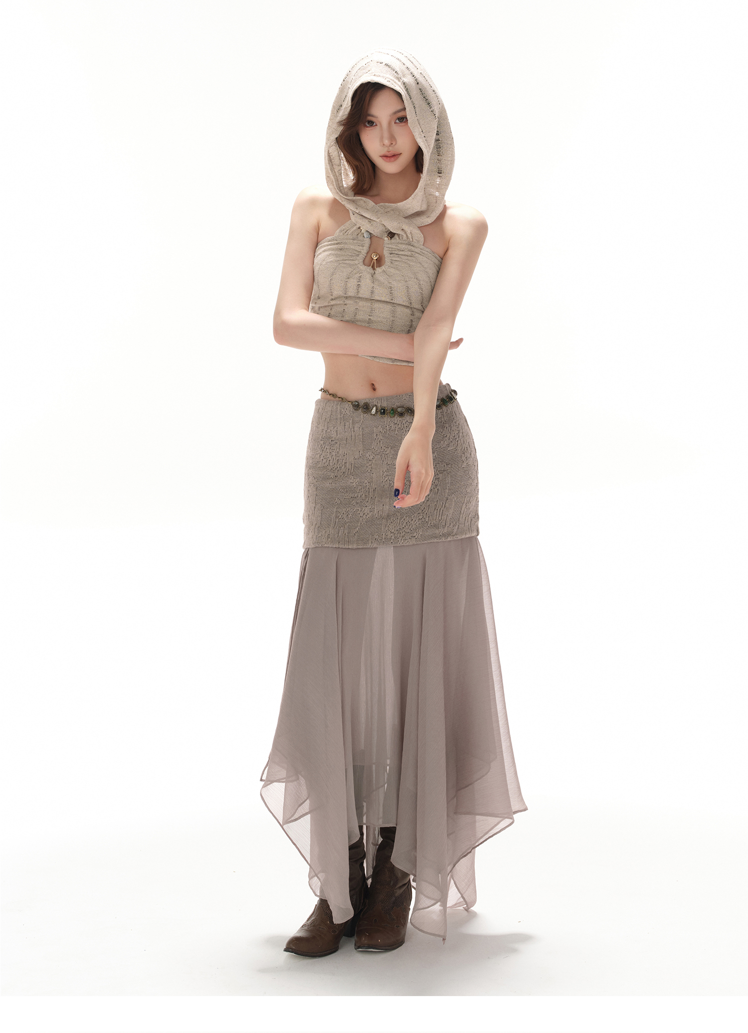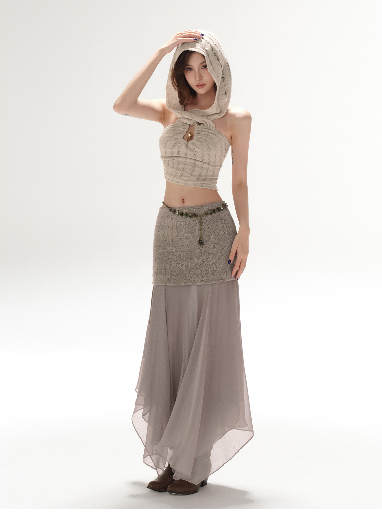 RessaLina Women's U-Neck Beaded Hoodie Crop Top - Cropped Elastic, Lazy Wave Design, Light Khaki